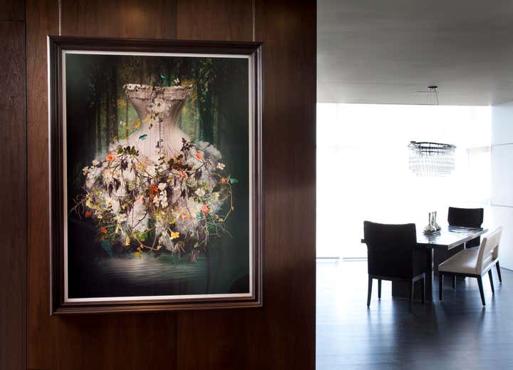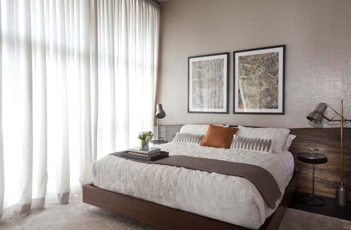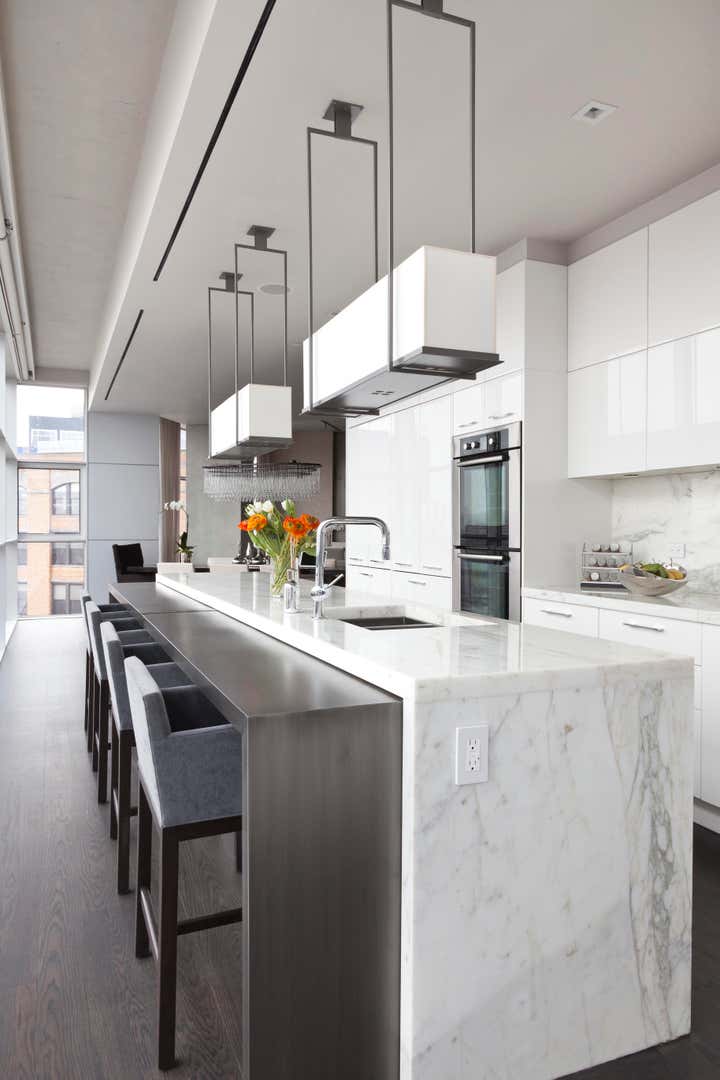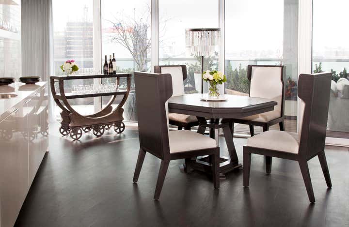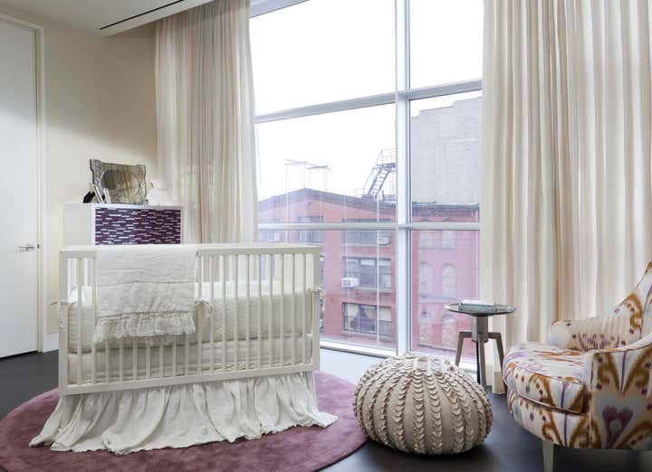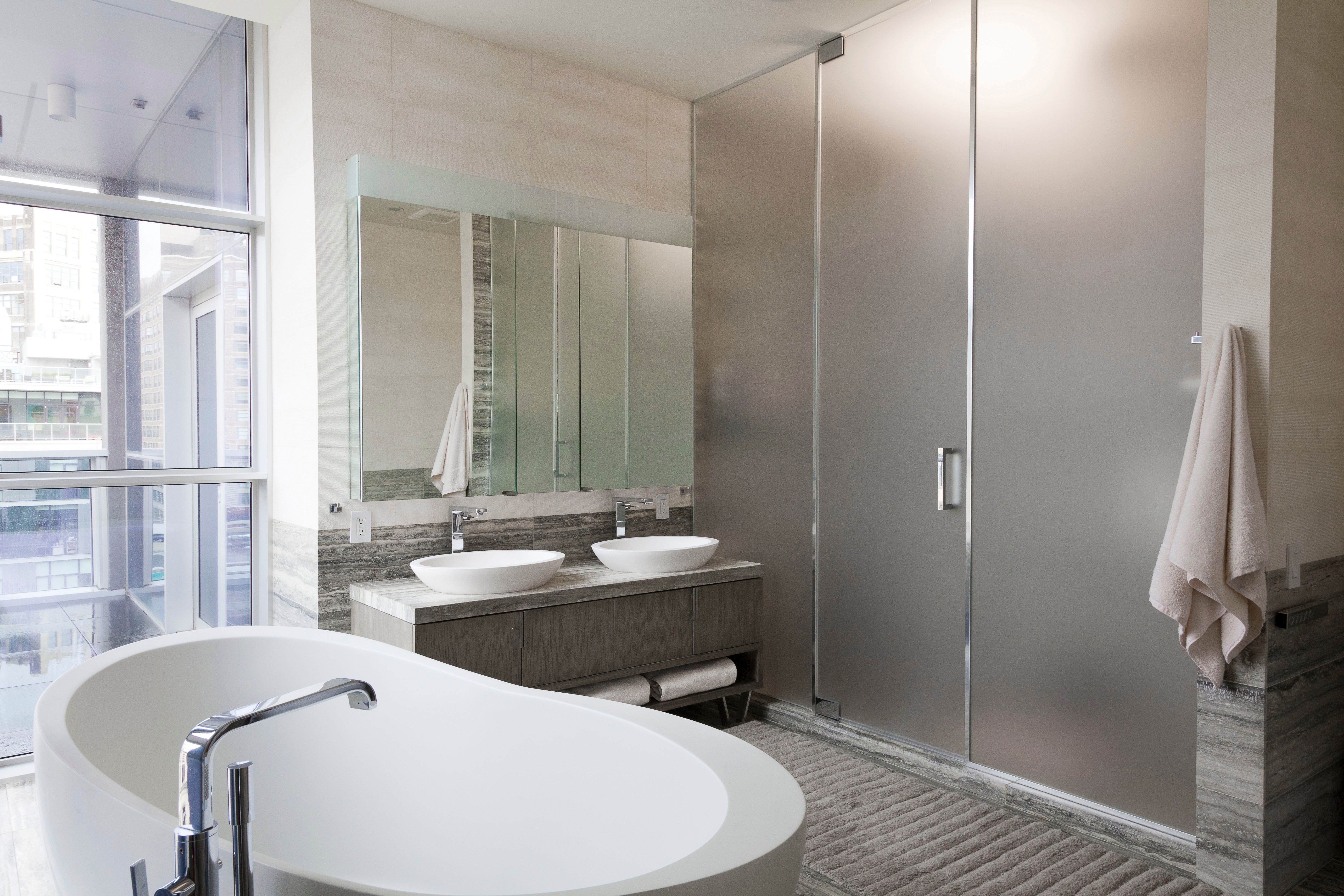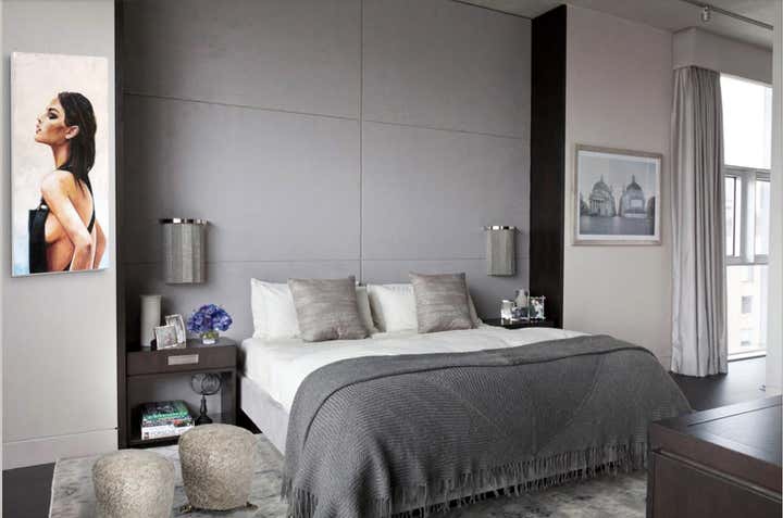 The overall airy and open design of this sprawling Tribeca Penthouse allowed us to tailor every aspect to the owners’ taste and needs. The color palette was kept soft, using cream, blue and gray tones to give a sense of tranquility and ease in this contemporary space. We added structure and functionality with built-ins, such as a library and media cabinet featuring high-end finishes.