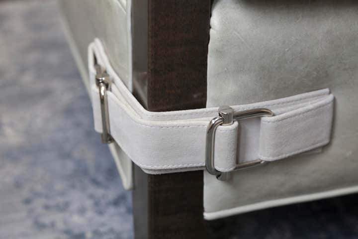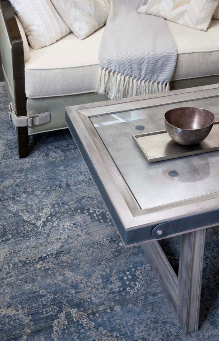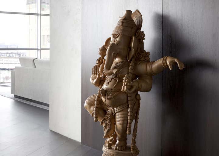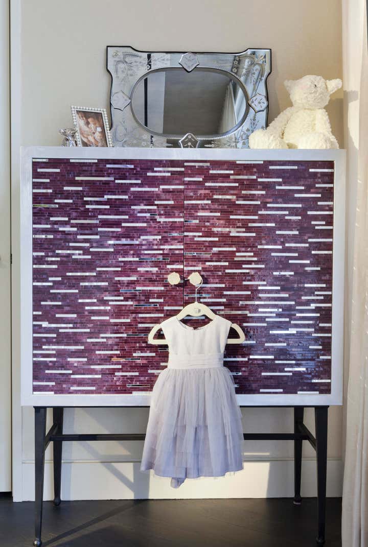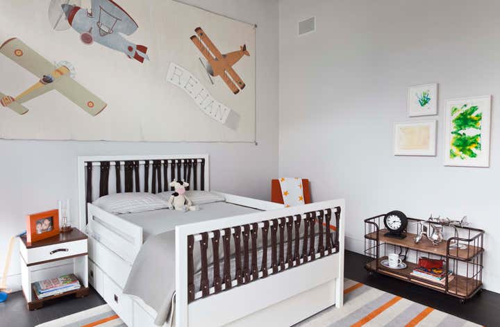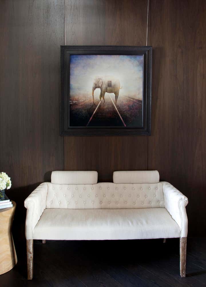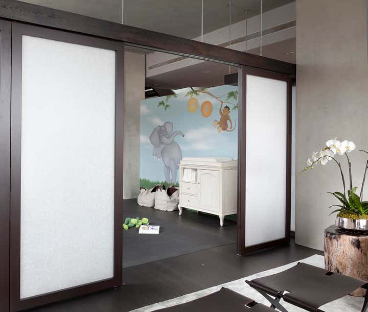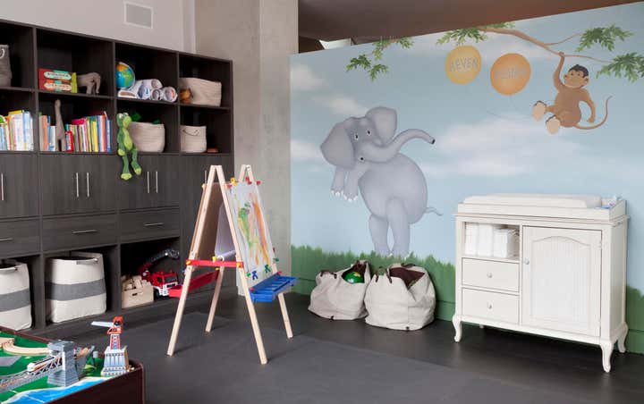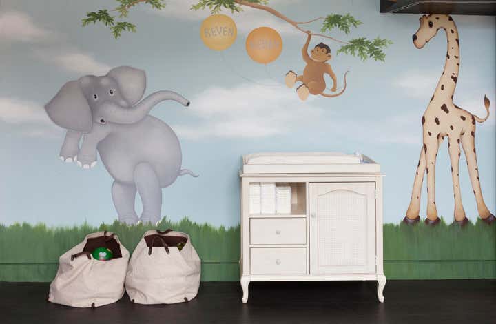 A pair of mid-century modern Jens Risom cradled wingback chairs are updated with contrasting gray suede and floral-patterned upholstery. We love to use unexpected elements to customize furnishings such as the loveseat’s strap detail with buckle hardware and the blue leather edging with nickel cap detail on a custom coffee table. We often work with our clients to bring in artwork that reflects their personalities and interests. In this case, the Ganesh statue and elephant print near the entry are an inspiring nod to their heritage and culture. A custom animal mural in a playroom makes for an energizing area for this young family.