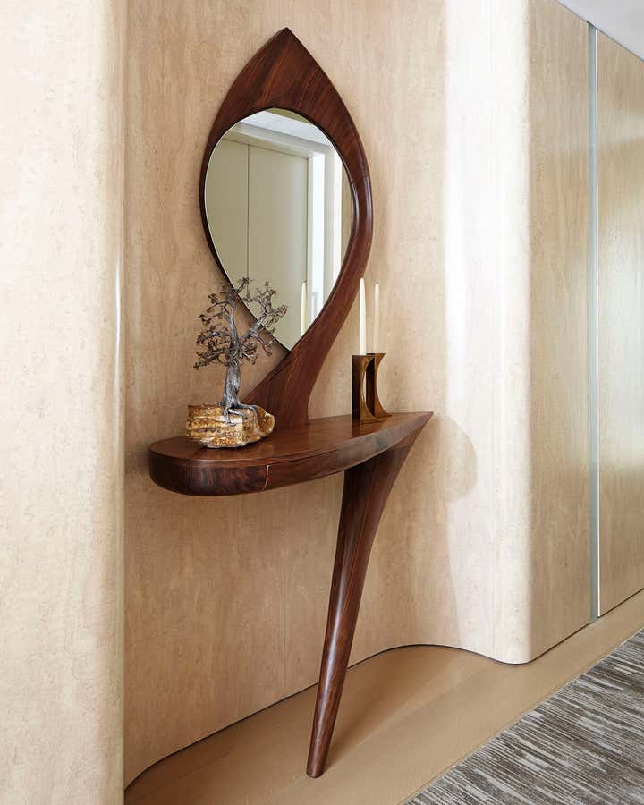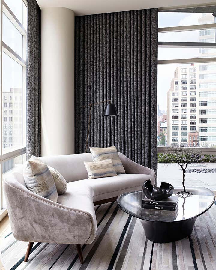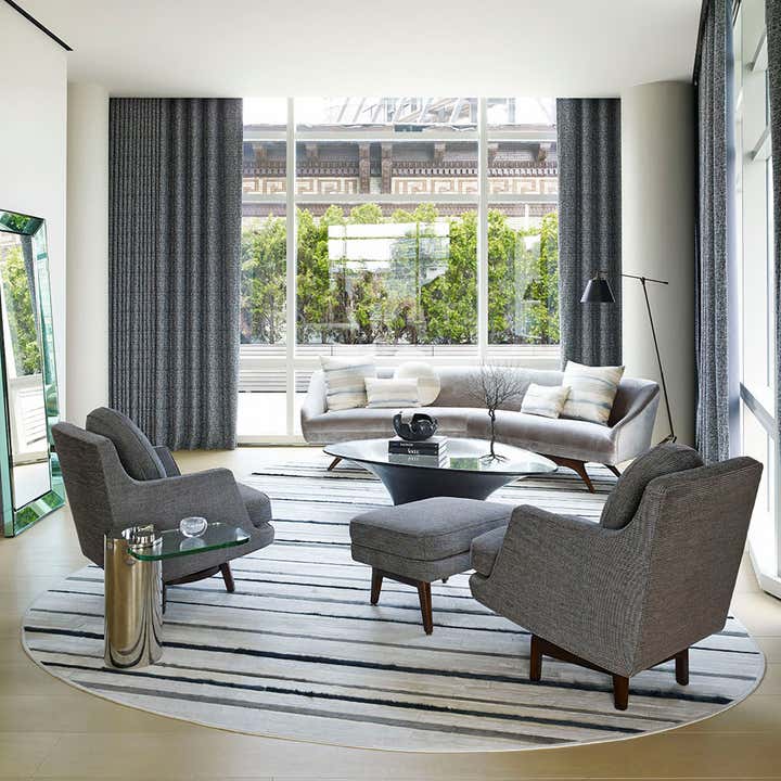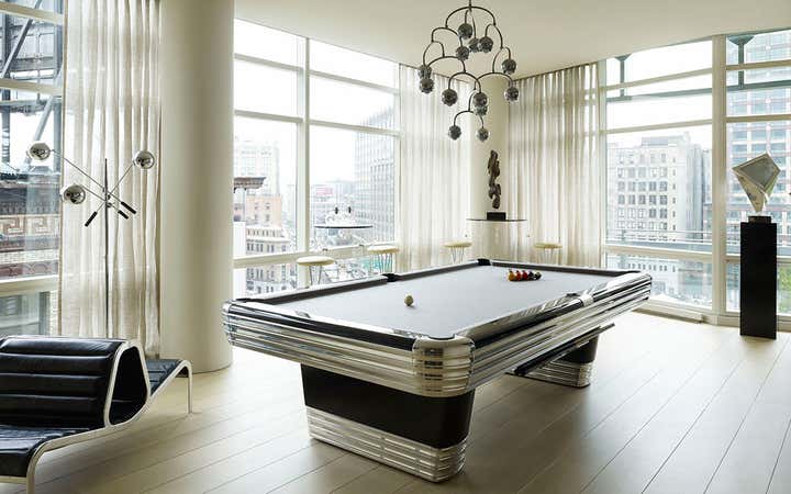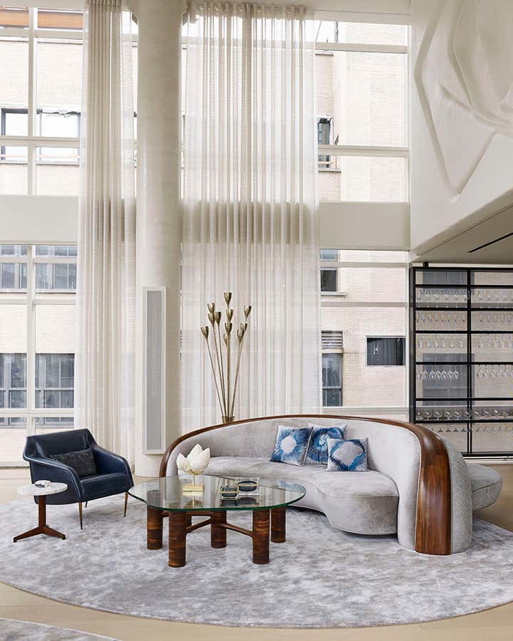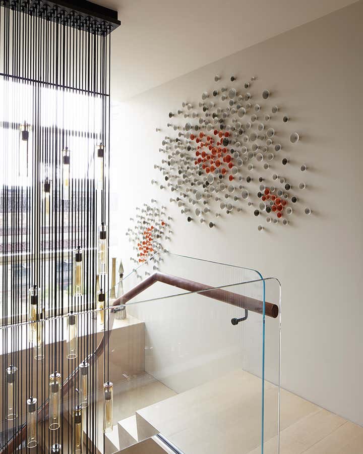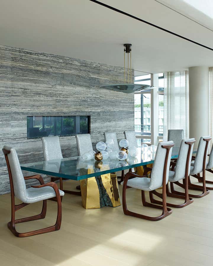 The architectural elements of the spectacular double height living room are mesmerizing in combination with the array of bespoke furnishings, accessories and art which include a monumental abstract plaster relief by artist Malcolm Hill, double sided Vladimir Kagan sofas, circular silk rugs and a sprawling hand blown glass chandelier made by Lindsey Adelman. A modern sculptural black and silver resin piano made by Based Upon creates a perfect environment for entertaining, as does the large dining table topped with laminated glass that sits upon handcrafted cast and welded bronze bases by Silas Seandel lit by a pristine vintage Fontana Arte chandelier hanging above.
