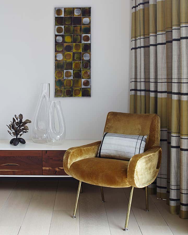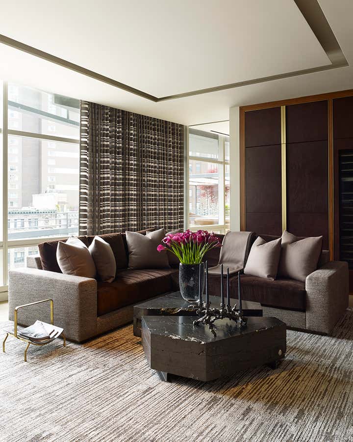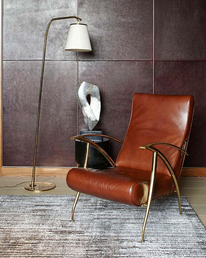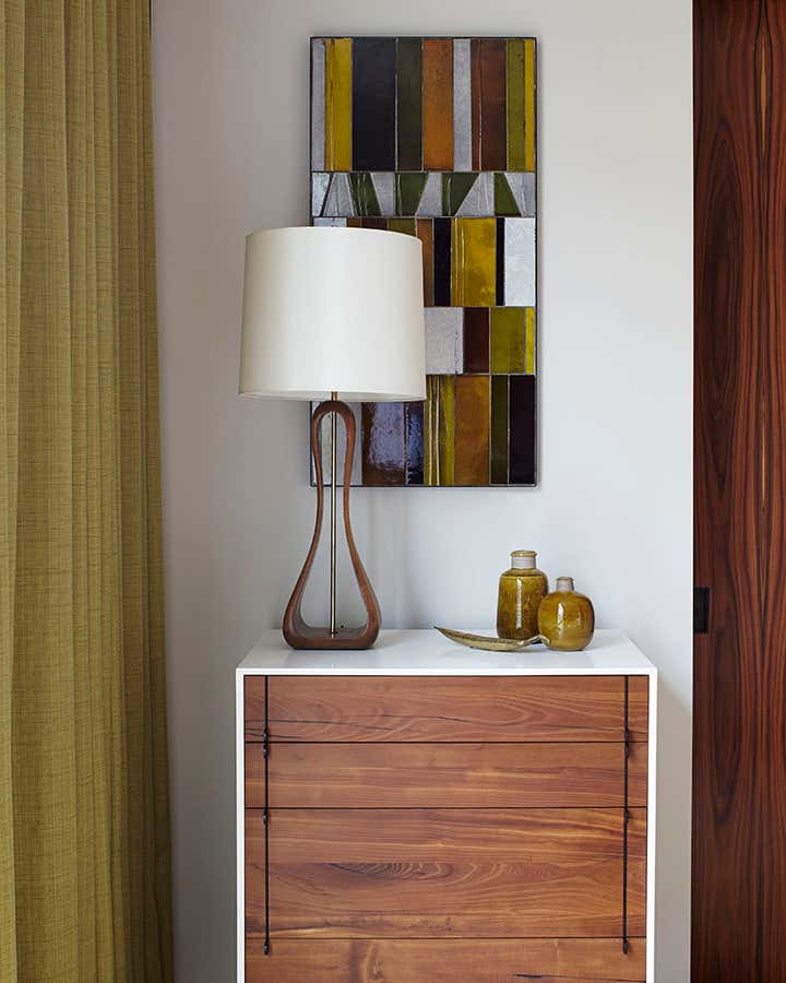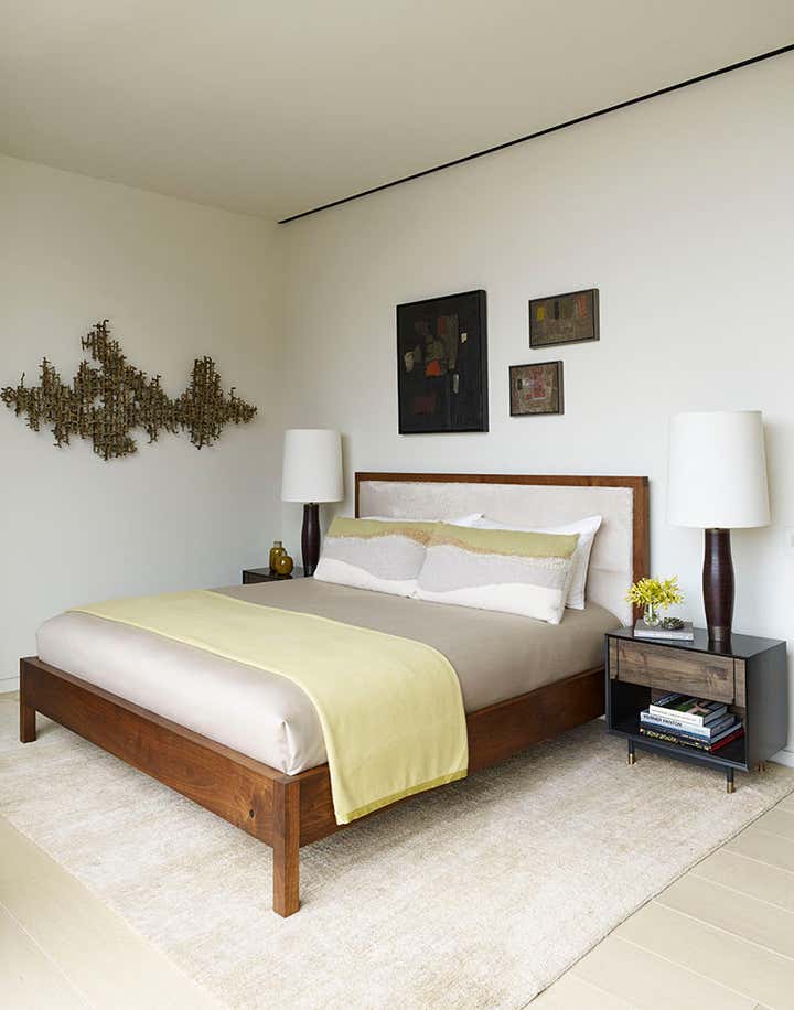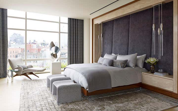 The luxurious environment of the living space carries over to the tranquil master suite. Exquisite fabrics cover the built in headboard as well as the vintage Vladimir Kagan sofa and chairs in the seating area that sit upon a custom, organic shaped cowhide rug by Kyle Bunting.