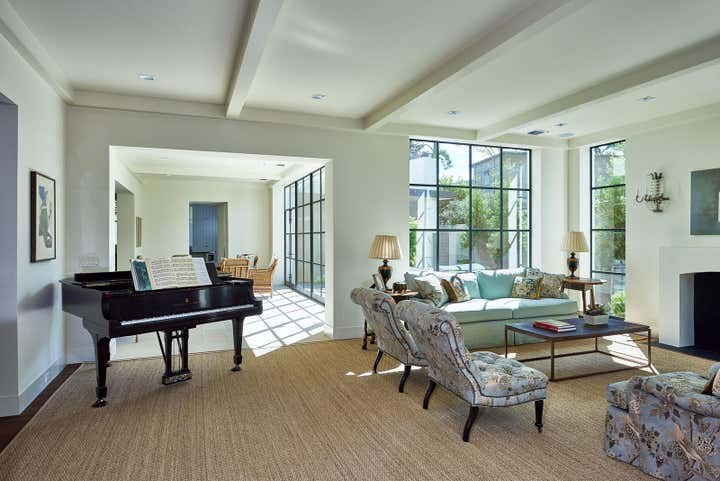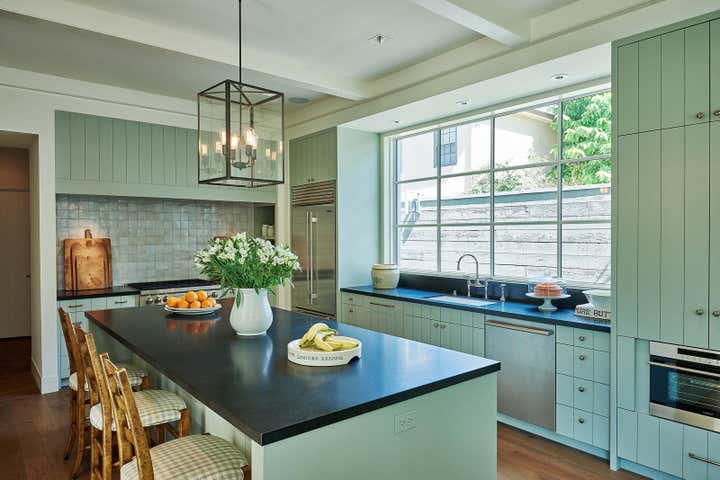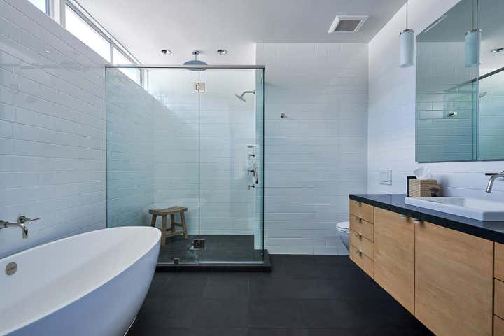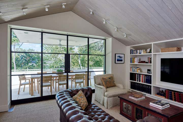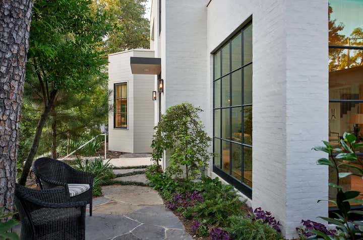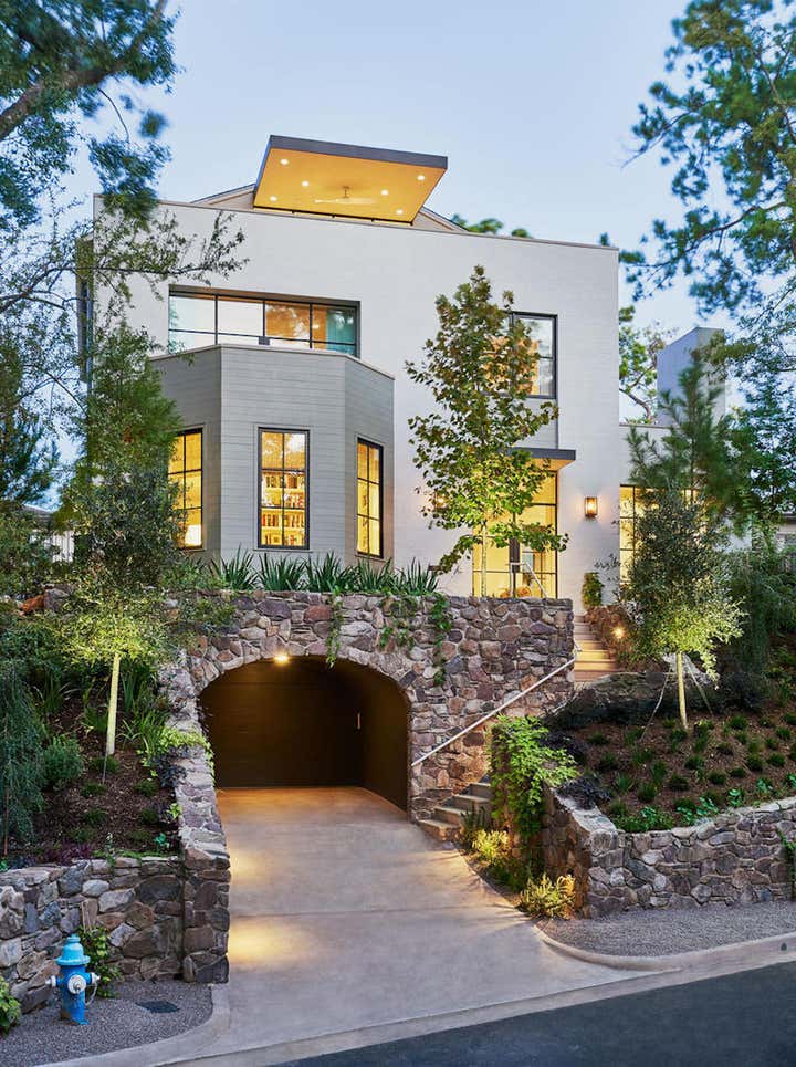A challenging site — small and steeply sloped — guided much of our design for this new home, which is set in a well-established neighborhood of circa 1930s dwellings. Because we tucked the garage and basement deep into the side of the hill, we were able to take full advantage of the above-ground portion of the lot and maximize the amount of living space on the two upper stories of the house. Window walls and an open floor plan combine to both frame beautiful views of the tree-covered hillside and let daylight flow throughout the interior. While the modern design of the house fits the style of the family, we used traditional materials — stone and wood — to make the exterior compatible with its forested location.