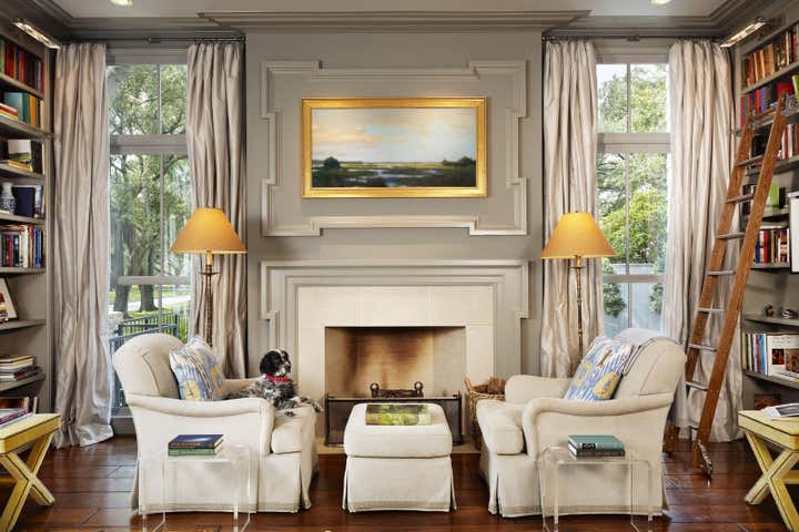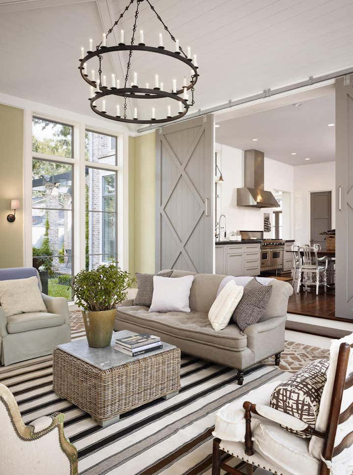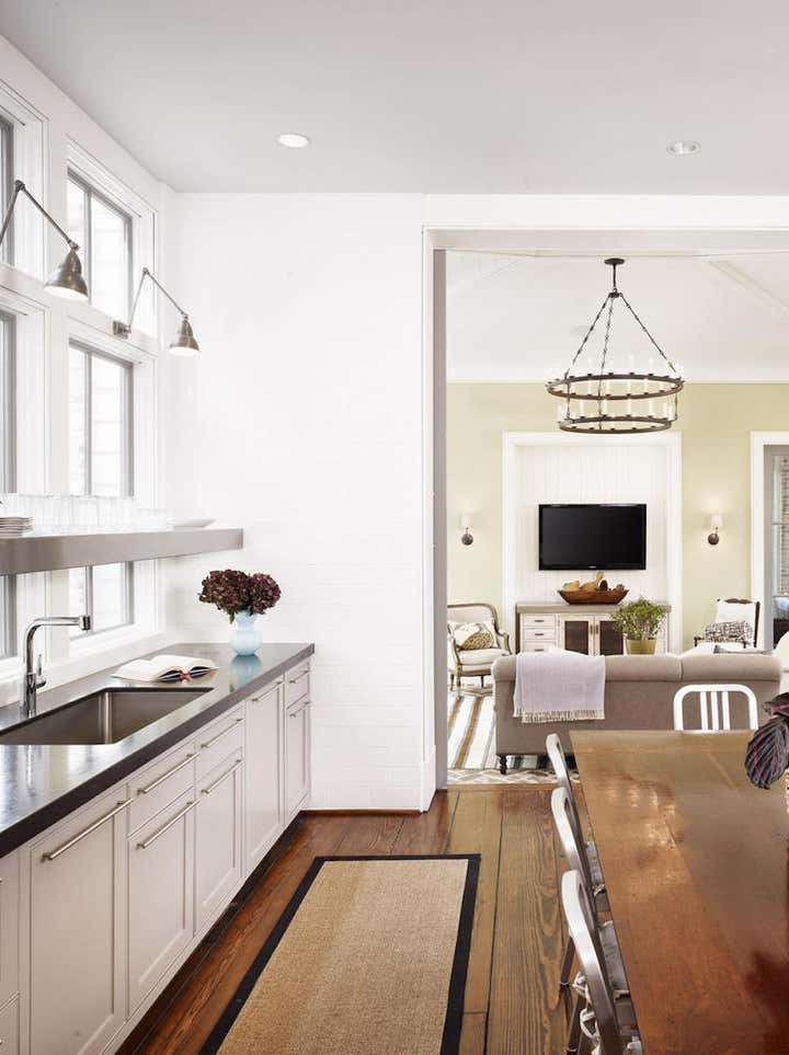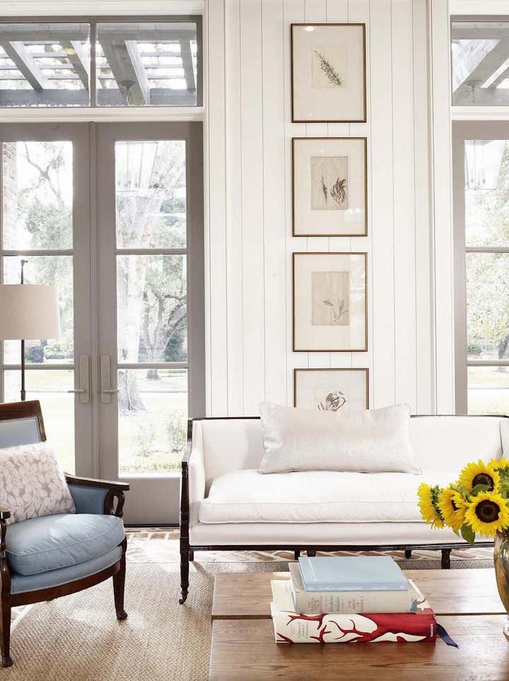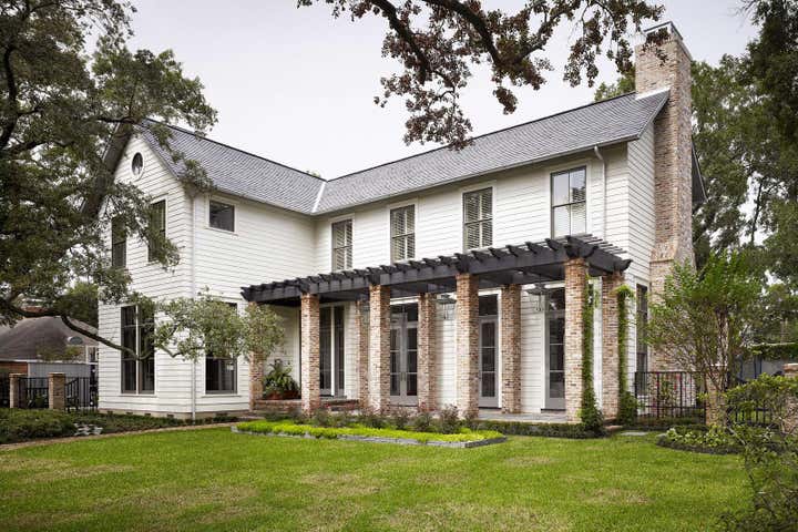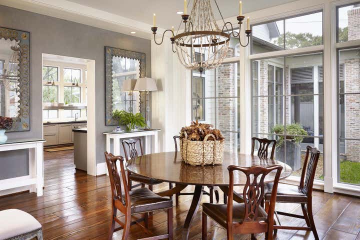 We took a spirited approach to designing this home. Using traditional materials — plank siding and recycled brick — in unexpected ways gives the building a presence that straddles past and present. Bringing the clapboard-style siding indoors and running it vertically on the walls emphasizes the generous height and modern proportions of the rooms and adds a bit of contemporary texture to the design, as well. French doors and tall windows topped with transoms let sunlight shine deep into the home and also provide a strong, rhythmic visual connection to nature outside. We paid particular attention to the floor plan of the house, sequencing the spaces in a way that feels both fluid and comfortable.