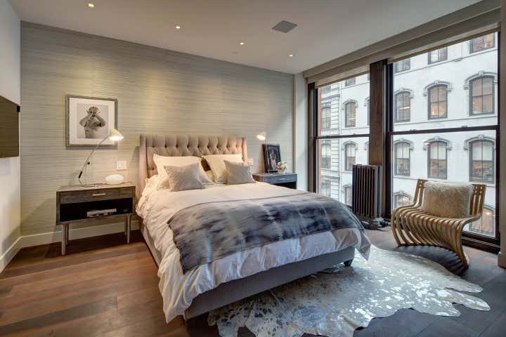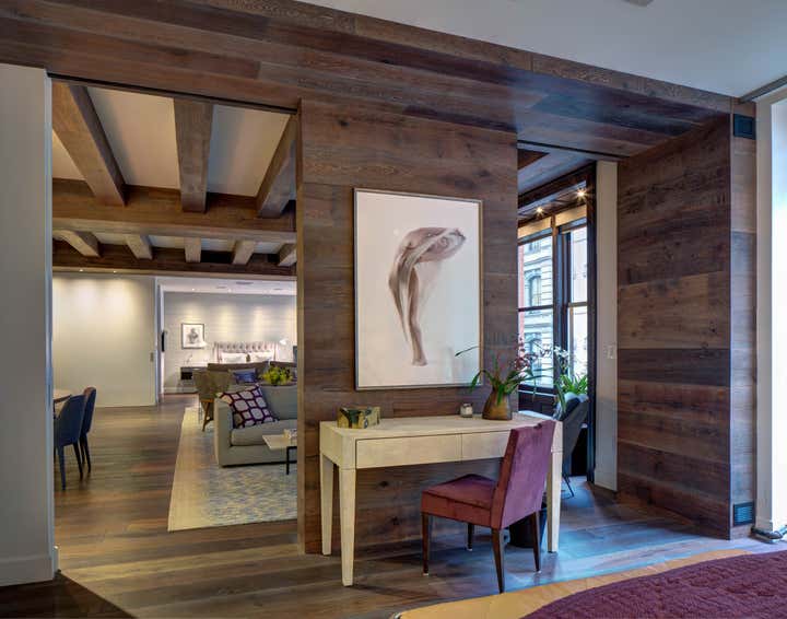 DHD Interiors worked with this couple to furnish their new recently renovated Flatiron loft. Navigating the dark wood paneling and flooring, DHD selected furniture and finishes that felt rich in color and texture while still cool and casual. Layers of grass cloth wallpapers were added to the main bedrooms to reduce the contrast of the dark wood and walls, adding brightness to the loft’s overall feel. Grey and mink-toned browns served as the foundation for a base palette, with deep burgundies and blues working as accents. This loft feels like a true downtown loft with its original brick and an industrial dining table, but stays balanced with softly upholstered furniture. Each piece, from the Dunbar chaise lounge to the organically shaped coffee table, displays a sculptural quality that contributes to a visually dynamic space.