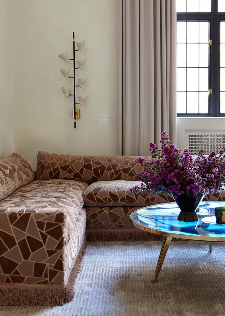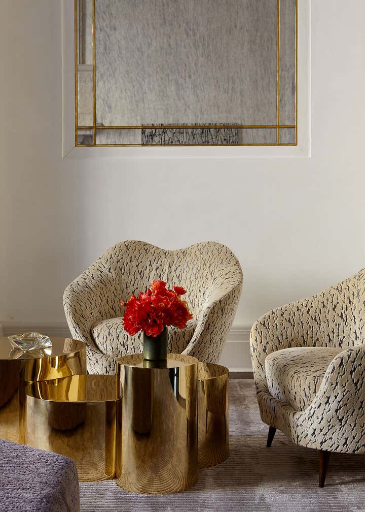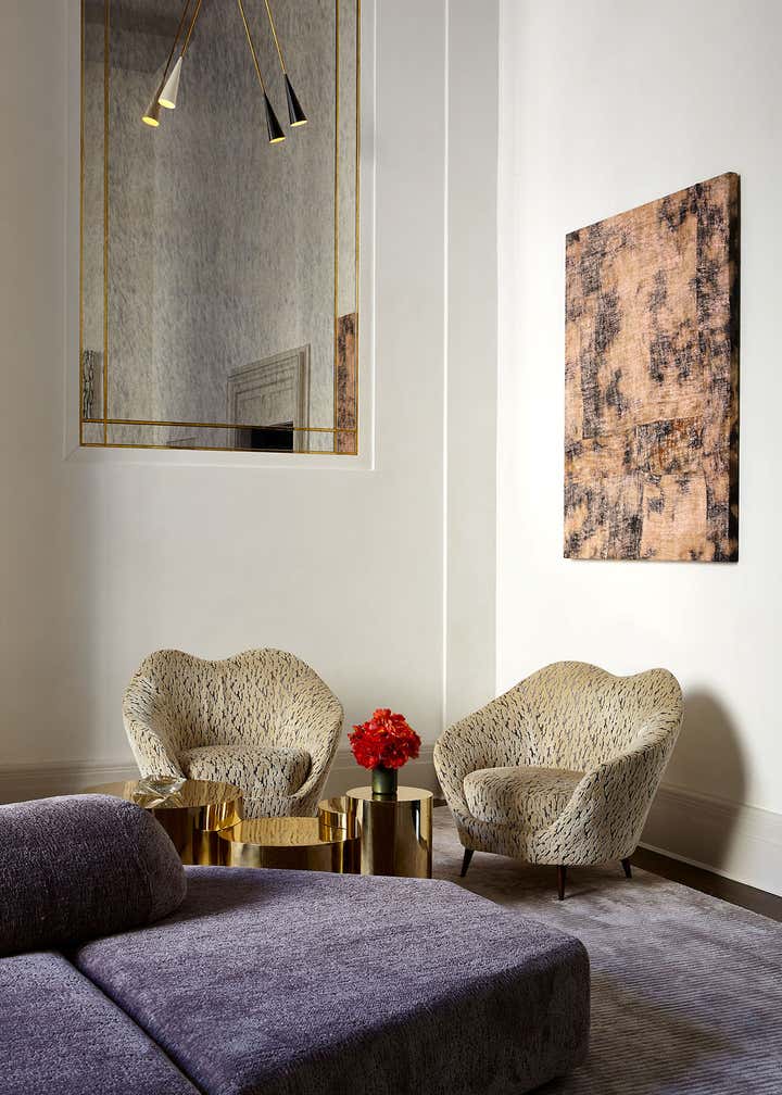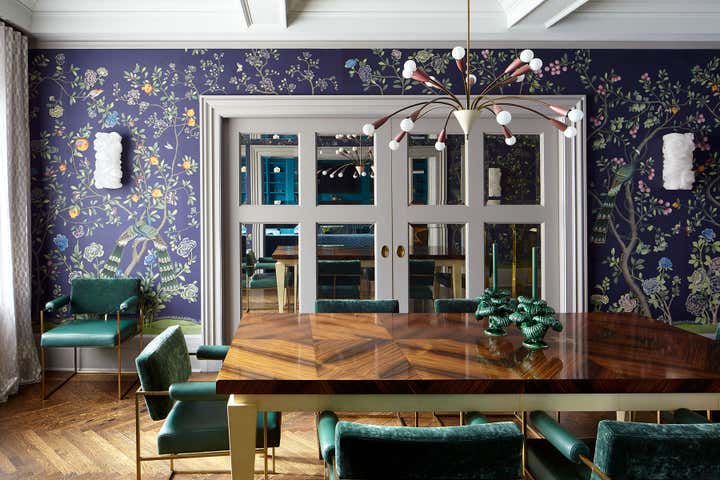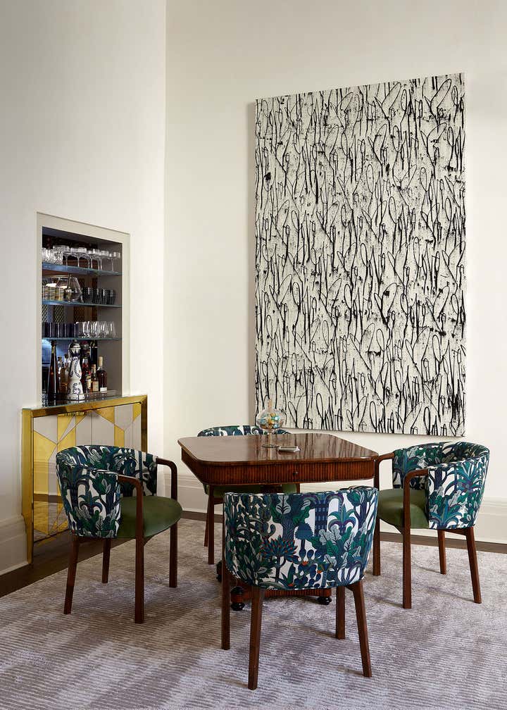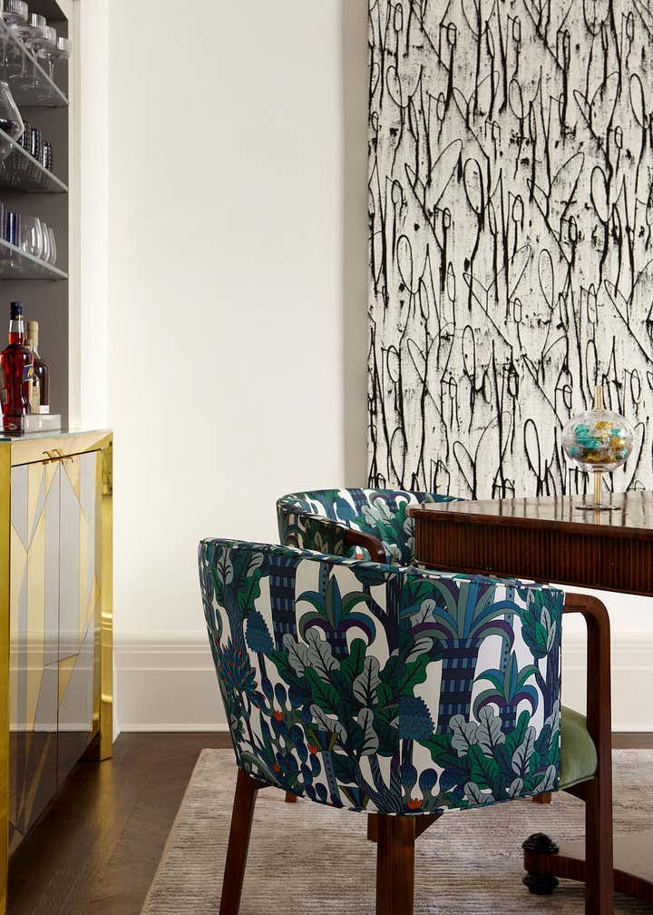 The centerpiece of the home is the double-height grand salon. We emphasized the volume of the space with the addition of a chandelier and mirrors flanking the fireplace, while creating a sense of livability and containment by reducing the number of openings. A custom-designed banquette sofa anchors the room, surrounded by vignettes that reflect the clients’ sensitive regard for vintage pieces and mid-century design. In the adjoining living spaces, we favored saturated color and pattern for more intimate, jewel box experiences.