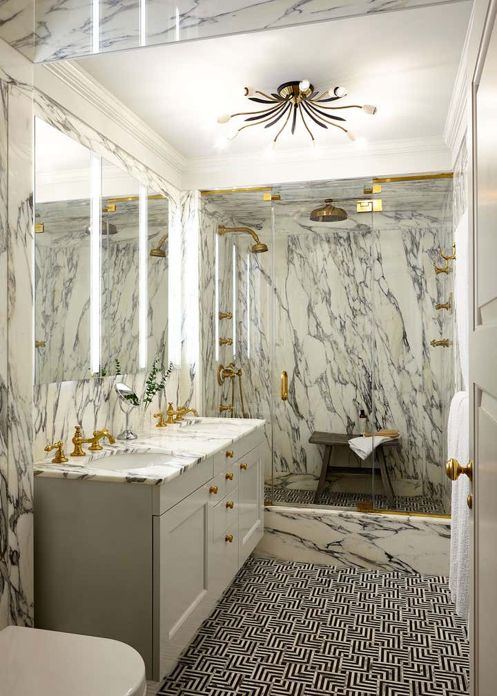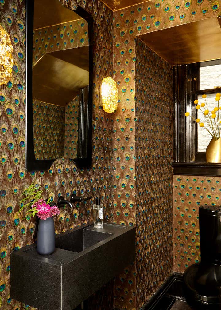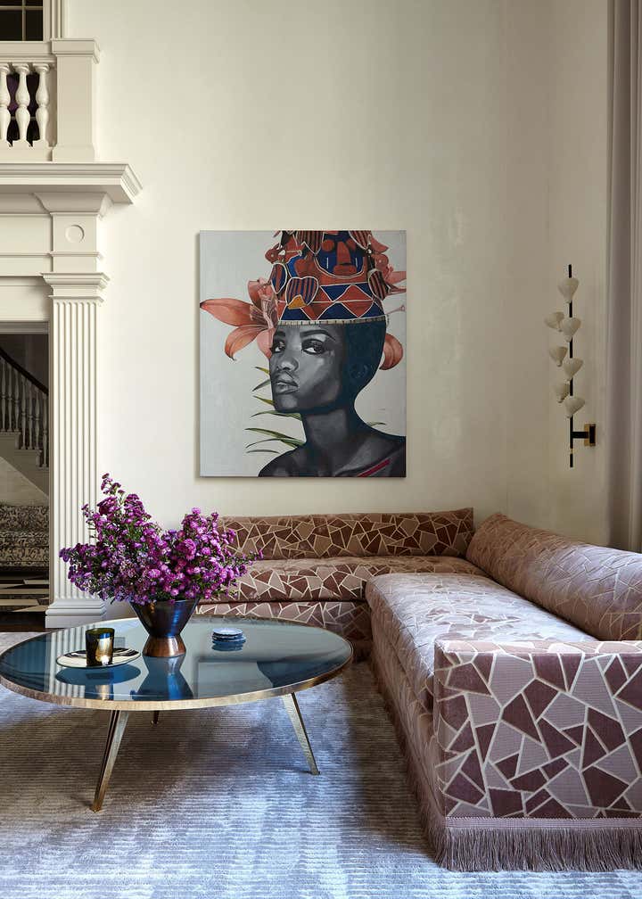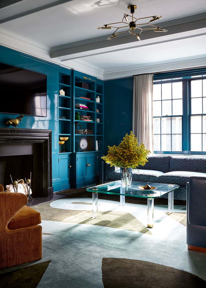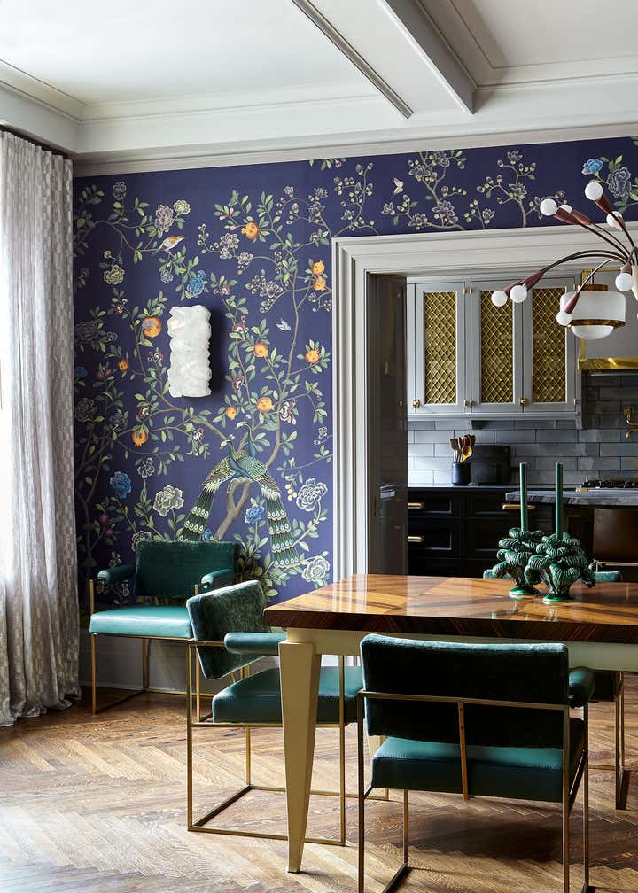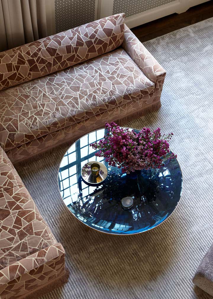 The centerpiece of the home is the double-height grand salon. We emphasized the volume of the space with the addition of a chandelier and mirrors flanking the fireplace, while creating a sense of livability and containment by reducing the number of openings. A custom-designed banquette sofa anchors the room, surrounded by vignettes that reflect the clients’ sensitive regard for vintage pieces and mid-century design. In the adjoining living spaces, we favored saturated color and pattern for more intimate, jewel box experiences.