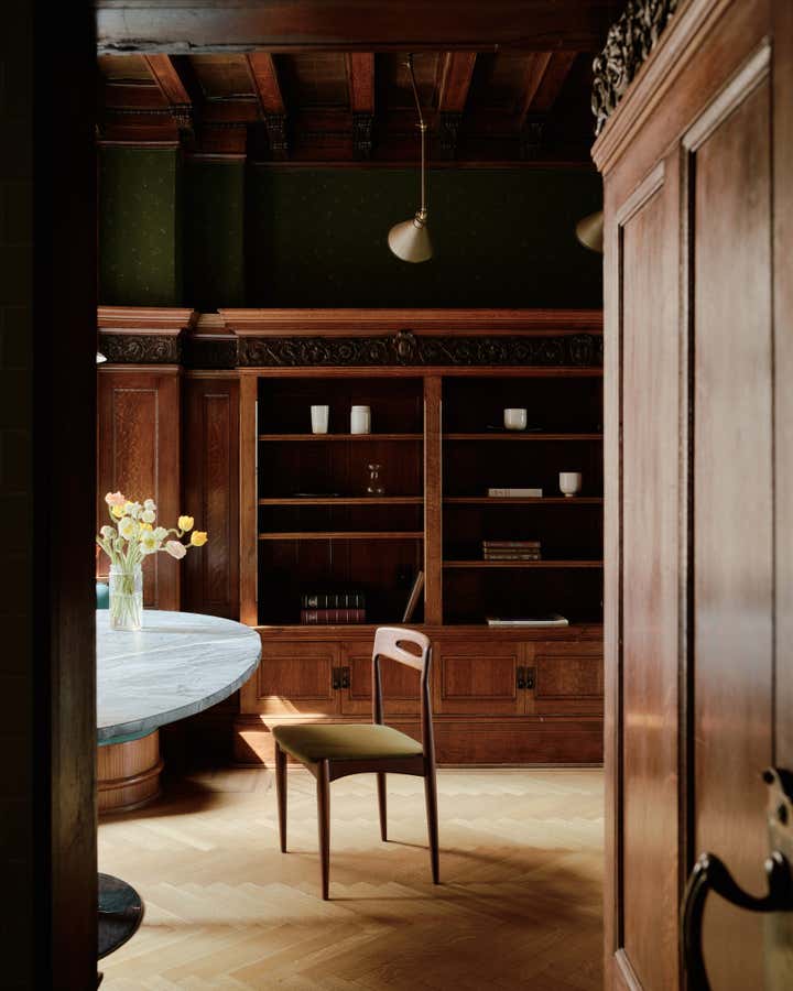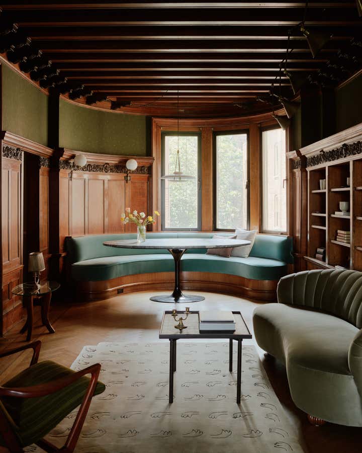 Lee drew inspiration from one of the apartments original libraries, which featured wood carving details and intricate embellishments. In the library, Lee created a semicircular banquette in plush cerulean velvet, following the curve of the bay window and transforming the space into a