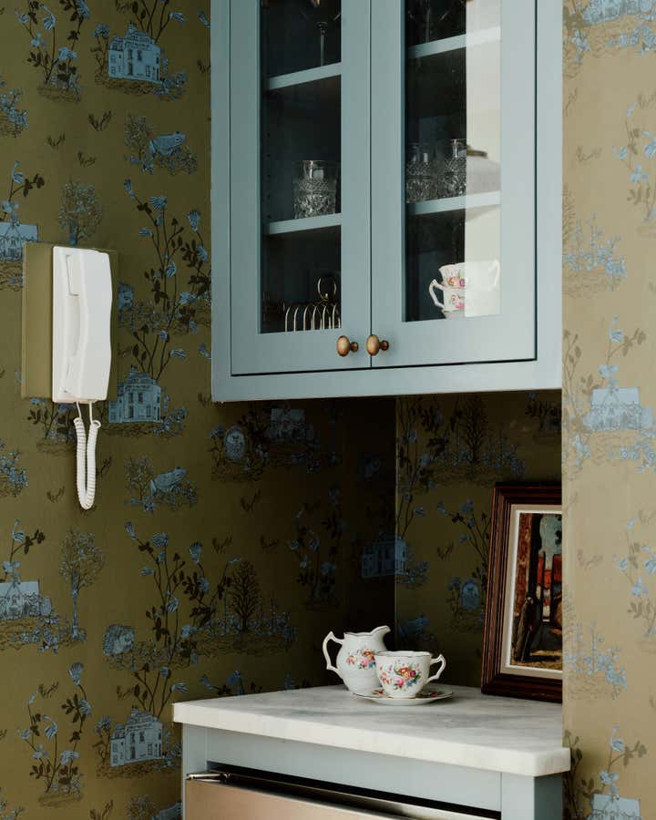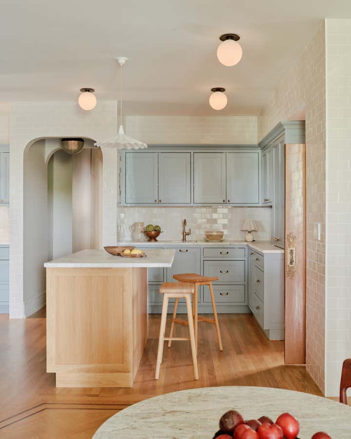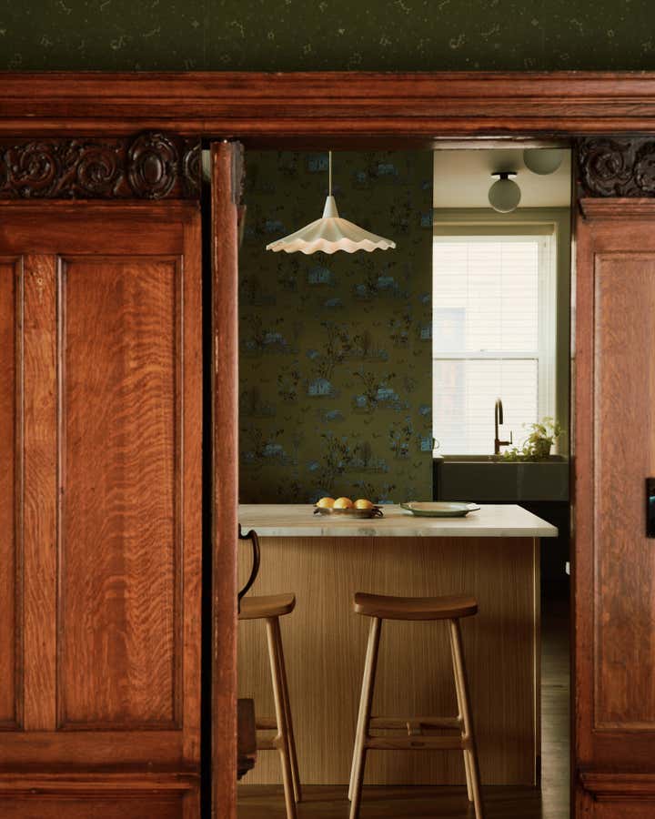 inspired by the original library. The homeowners, a family with two young children who have previously worked with Lee on their country house, purchased their neighbor s apartment intending to merge it with their existing space to create one single home. Lee aimed to reconfigure a thoughtful layout that would enhance the flow of the space while honoring the building s pre-war roots and incorporating the inherited architectural details seamlessly into the new floorplan. Lee removed multiple walls and a shared hallway to connect the two apartments. The generously sized kitchen, a fusion of two distinct layouts belonging to the respective homes, now features two separate "wings" with individual functionalities and utilities. Adorned with floor-to-ceiling subway tiles reminiscent of old New York s gilded age kitchens, the space is connected by a beverage station at its heart, embellished