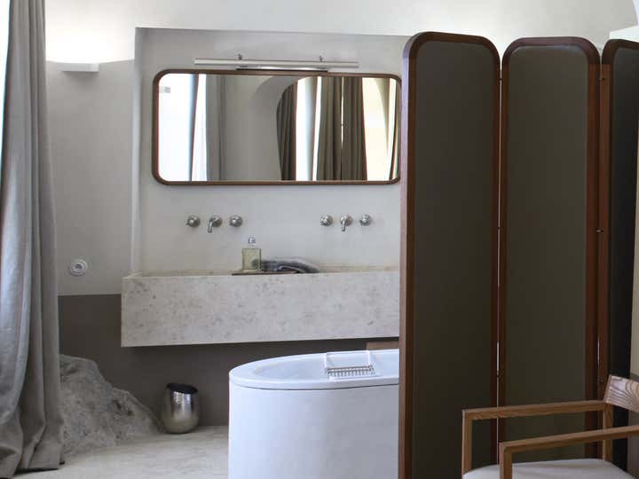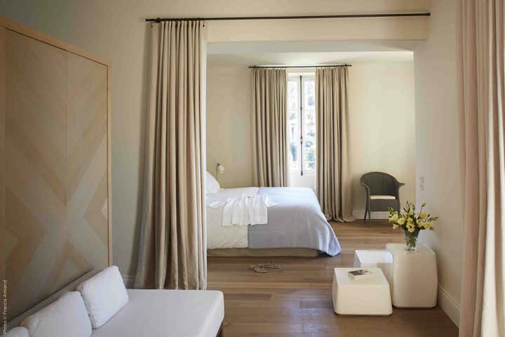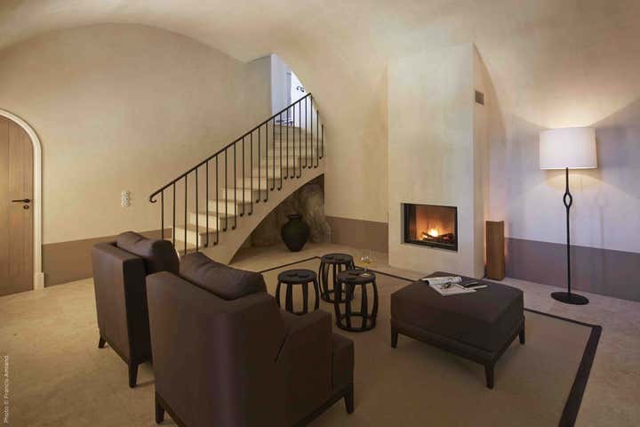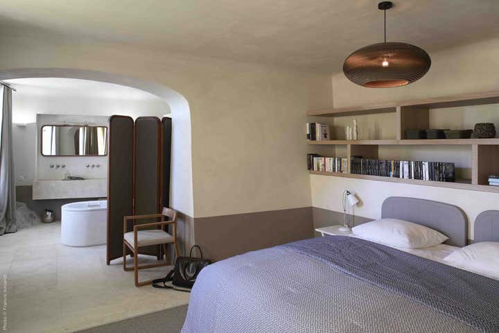 The spaces remain fluid, and the boundaries between rooms seem to disappear thanks to the unity and simplicity of the color palette used. Occasionally, a piece of hill rock can be glimpsed embedded in a partition, like a tribute to the surrounding nature. Barnes covers the walls with traditional lime chalk to preserve the Provencal soul of the spaces. When the floor is in stone, he uses a darker paint color to create a baseboard, a detail from the Provençal architectural language