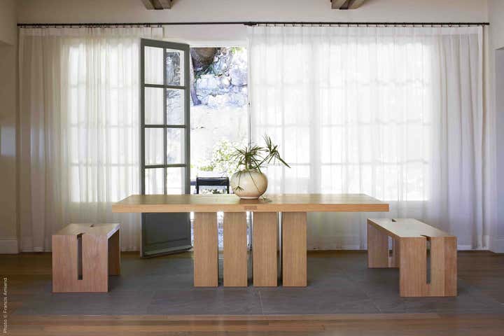 The kitchen plays an important role where entertaining is a must. It respects traditional codes, with a large central table and an old-fashioned gas stove. The exposed ceiling framework has been totally re-imagined. The adjoining dining room is deliberately uncluttered, highlighting the solid oak furniture designed by the Barnes.