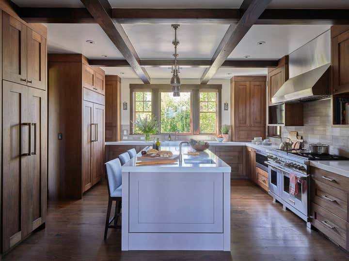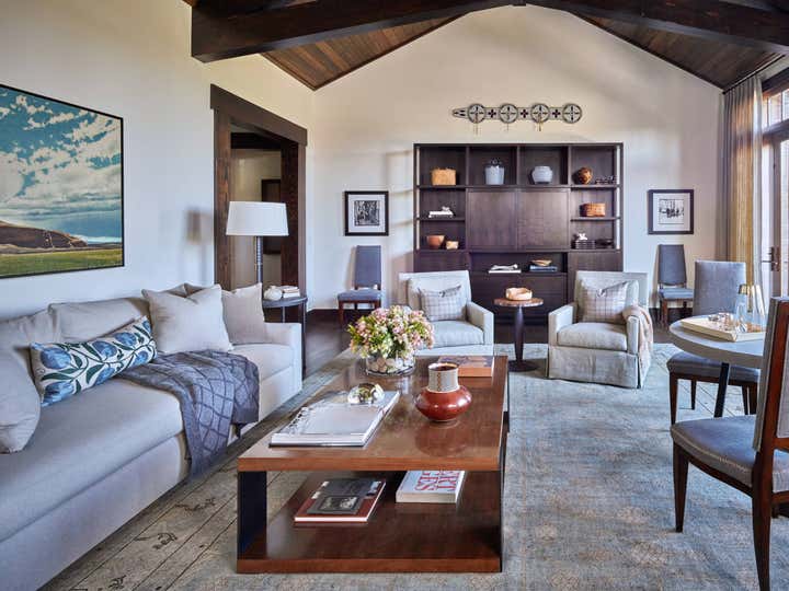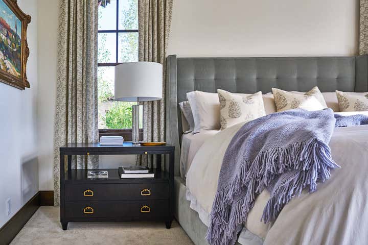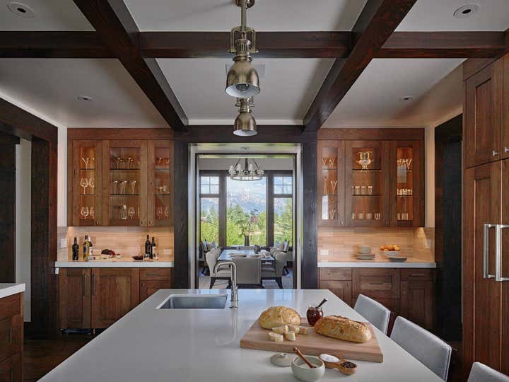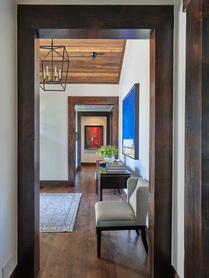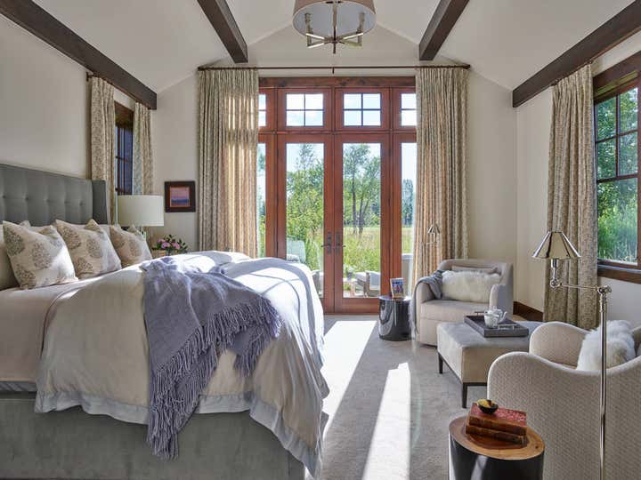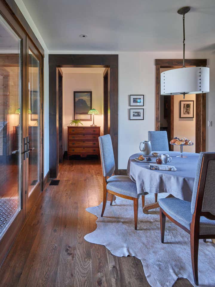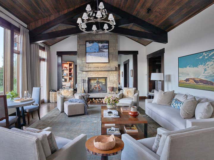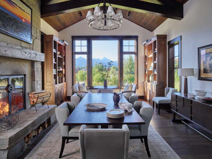 Nothing obstructs this stately residence’s view of the Teton Range, a panoramic site calling for a serene approach. Working within the wooden framework of the modern-lodge architecture, subtle pairings of interesting textures, cool tones and fine art create an ambiance of calm communion with nature.