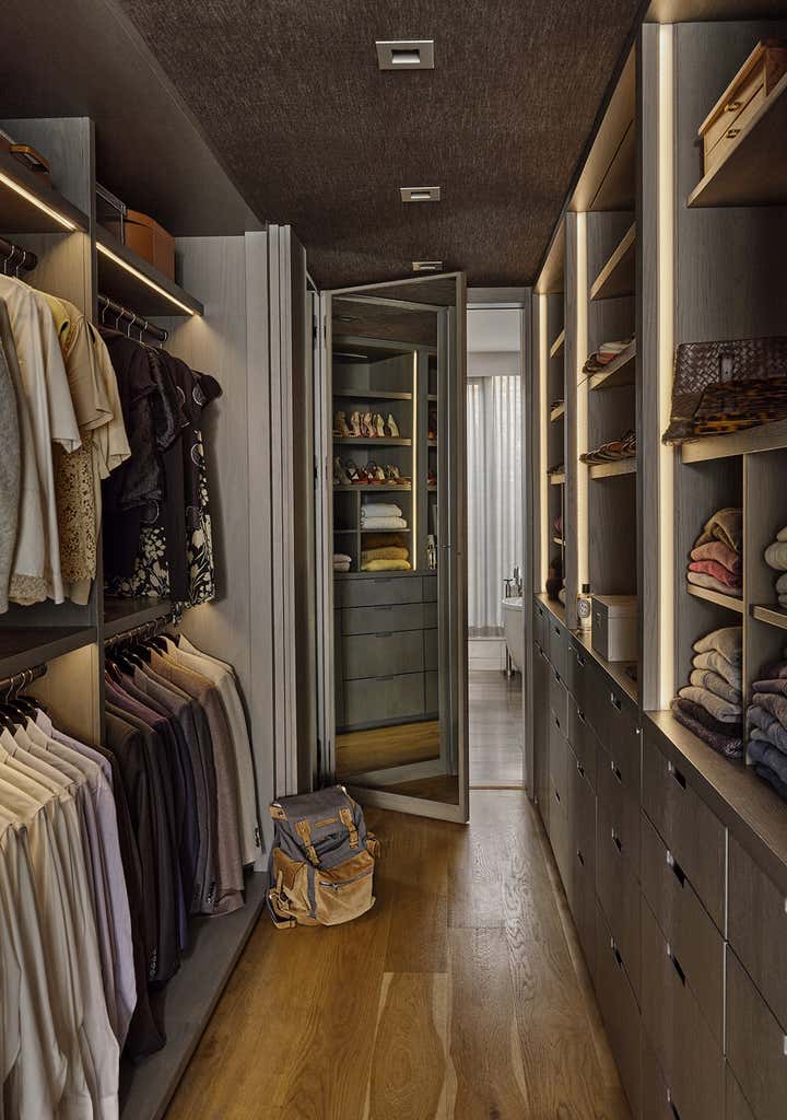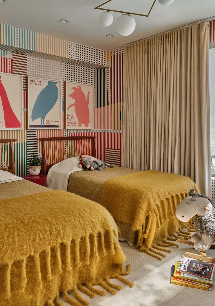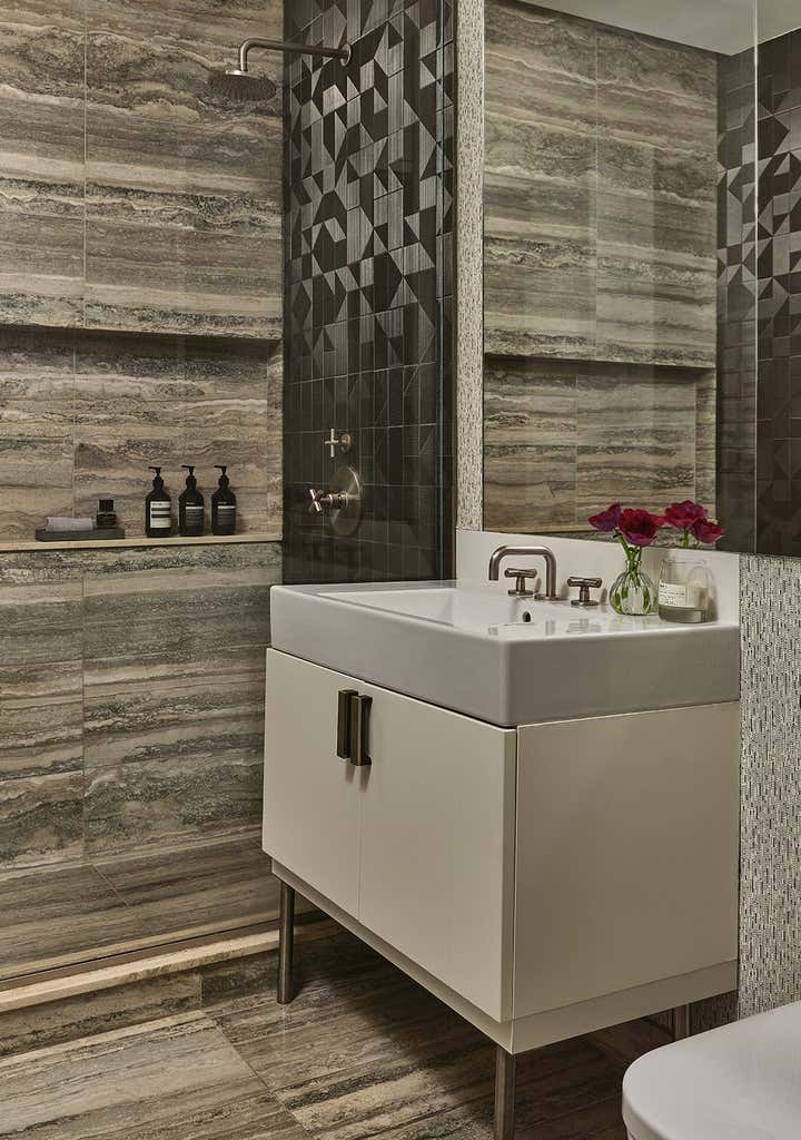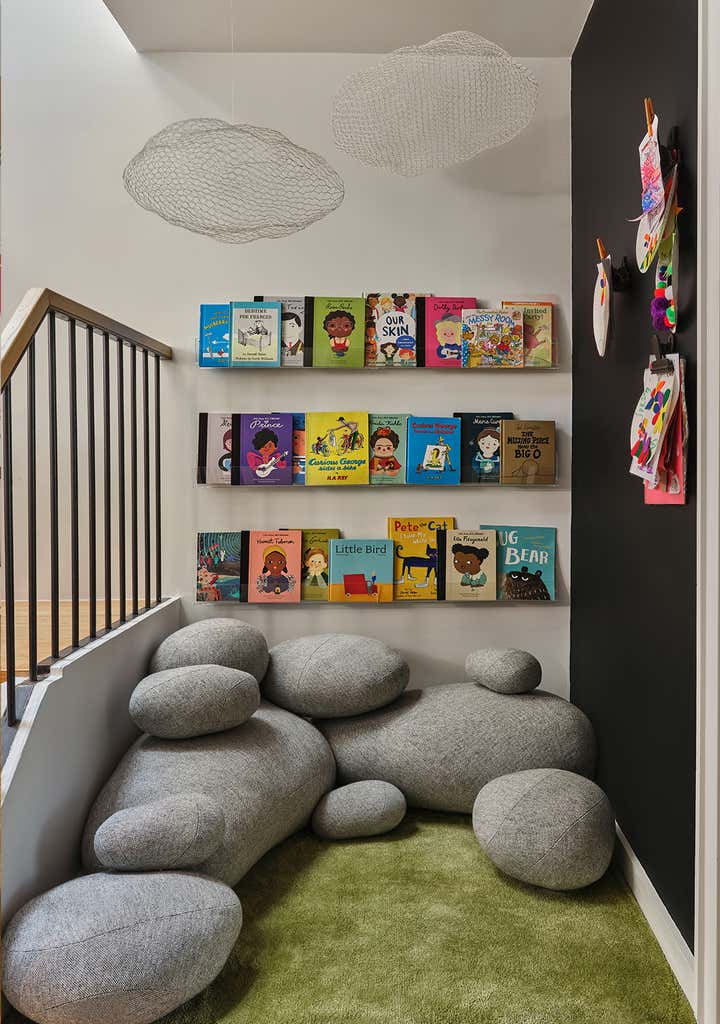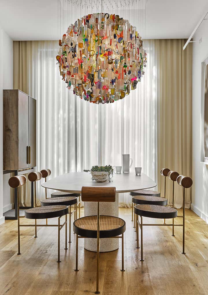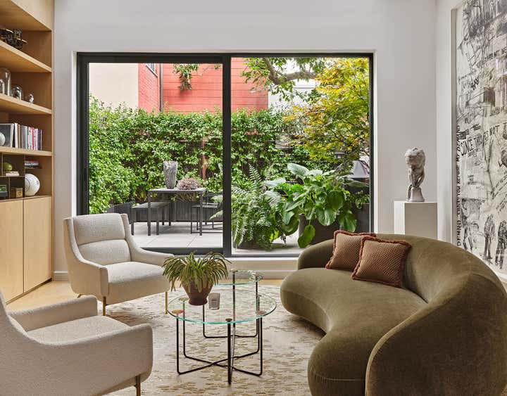 Stretched over six floors, this modernist Brooklyn townhouse underwent a painstaking, top-down renovation to imprint a home with verve and poise for an infrastructure investment firm CEO and his young family. The grand proportions of the space with its seemingly intentional, exhibitionist-scaled windows felt like an invitation to theater - to summon the light conveyed, choreograph its shifting moods and set the stage for lavish living. Newly conceived millwork components, sculptural furnishings upholstered in luxe textiles and a bevy of statement lighting pair with a museum-worthy collection of art for a space that exudes conviction and whimsy.