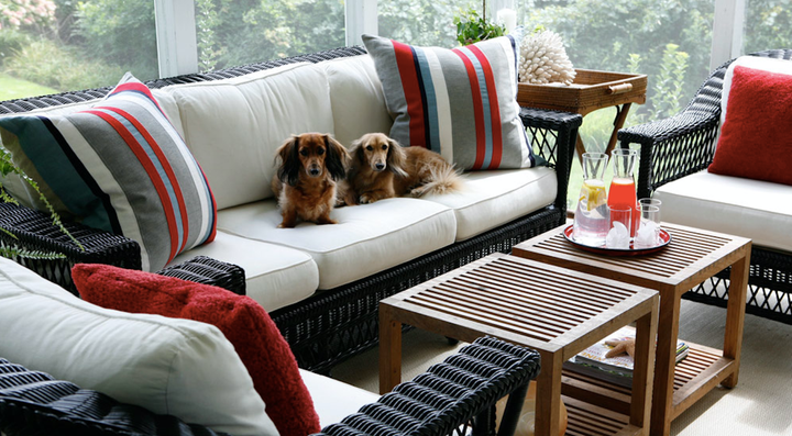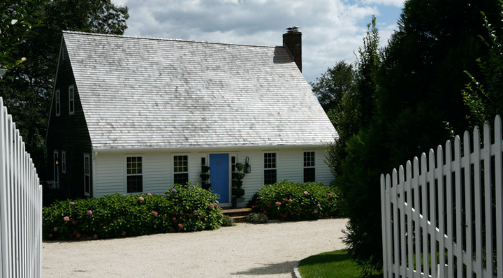 This “picture perfect” cape-cod style home encases a warm and relaxed interior. Bold color and unexpected juxtapositions of texture – warm woods, sea grass, silk taffeta, and crisp white painted walls – create an inviting weekend getaway. Furnishings are an eclectic mix of both antique and contemporary pieces – a culmination of items collected from flea markets in England and France. The surrounding landscape is an extension of the home’s interior – casual and uncluttered. An expanse of grass leads to the pond, and the house and adjacent screen porch are surrounded with hydrangea.