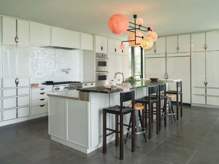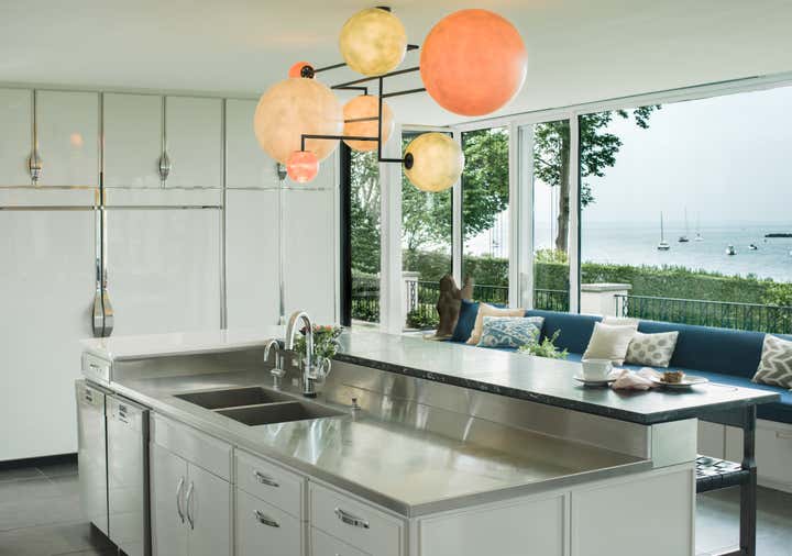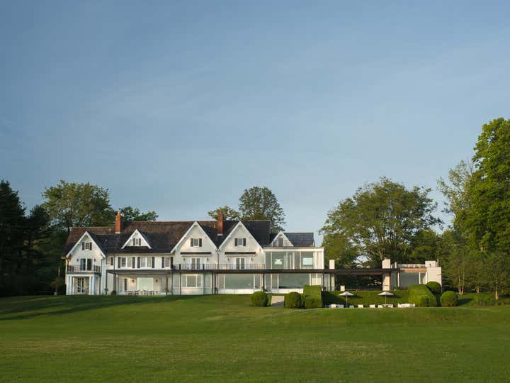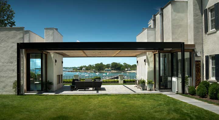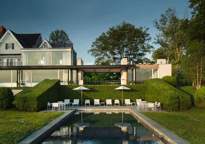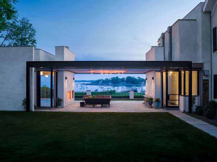 Several modern additions and a renovation transform a traditional 1915 mansion on over six acres on the water in Darien, Connecticut, seamlessly blending old and new. Each intervention incorporates large walls of steel and glass to expand and maximize water views. Simple forms are clad in natural stucco with a smooth finish, similar in color to the original stucco on the house, but contrasts the texture, for a subtle distinction between new and old. A separate pool house/yoga studio, kitchen and two outdoor patios are connected by a steel arbor and trellis across the water-side elevation that weaves the additions together with the existing house. The new kitchen is relocated to the center of activity of the house toward the heart of the property with the best views. The outdoor patio, axial with the pool, provides shade in the best position on the site. This is phase one of a larger master plan that includes a sports building with indoor lap pool, spa and indoor batting cage adjacent to the tennis court, as well as a residence for three artists. Close collaboration with the landscape designers yielded a synthetic whole that fully integrates the site, landscape and the architecture. With Fine Concepts, F2 Environmental Design and Anastos Engineering.