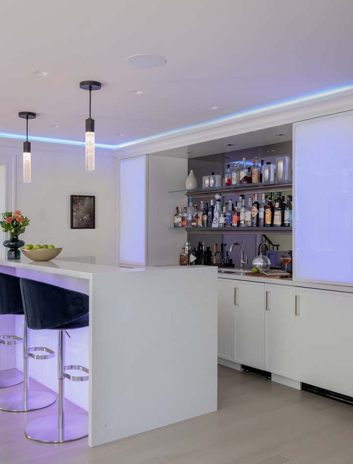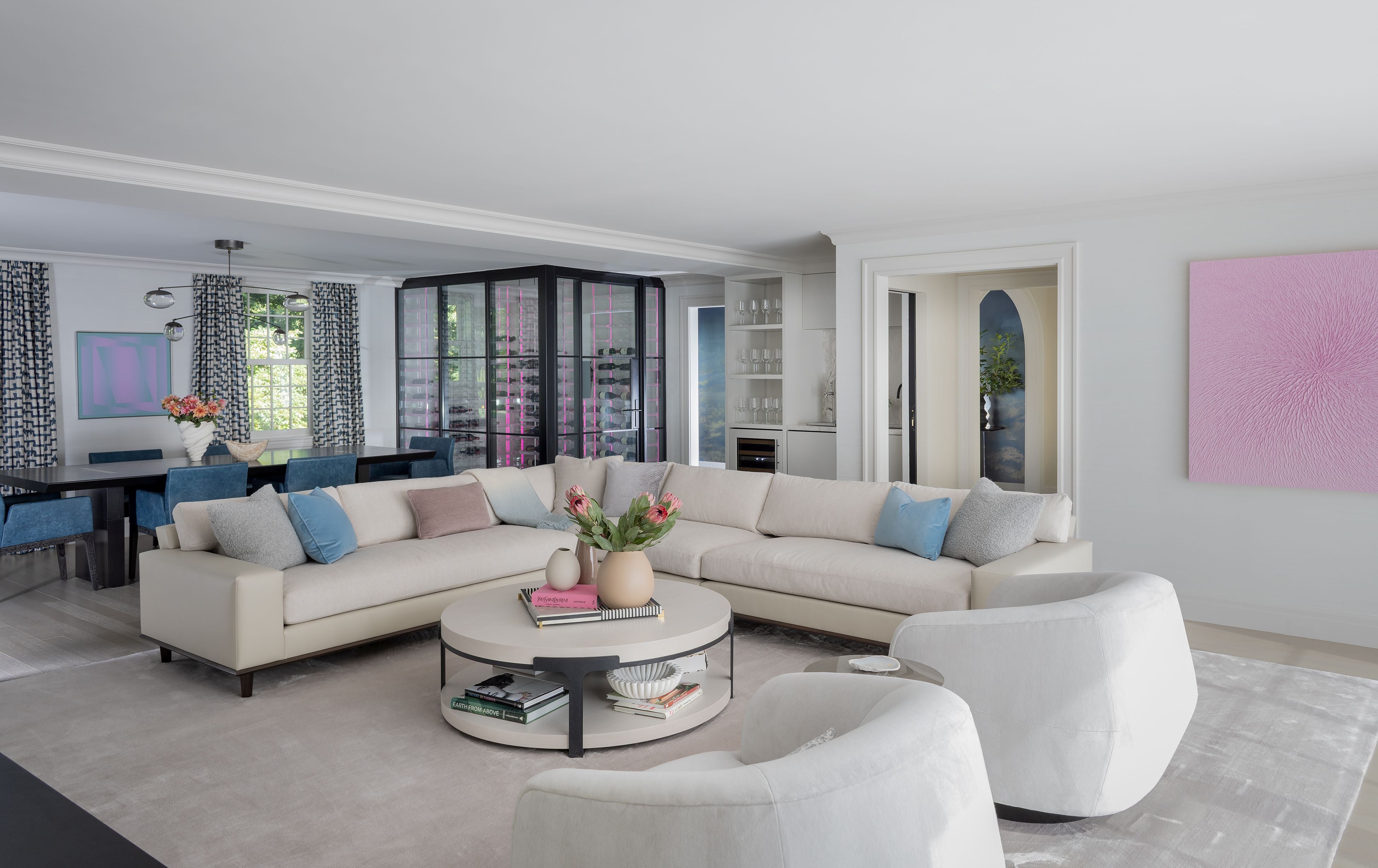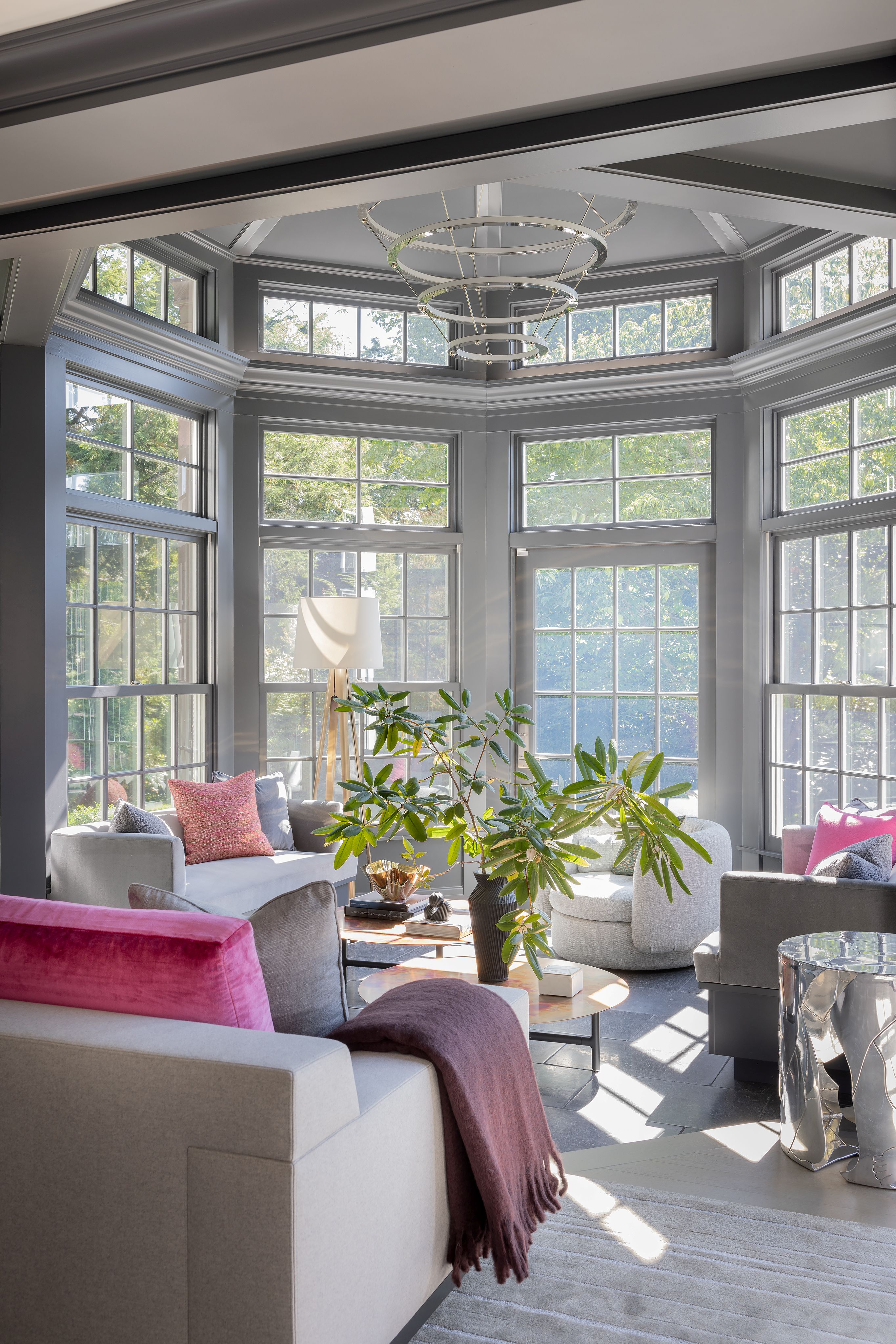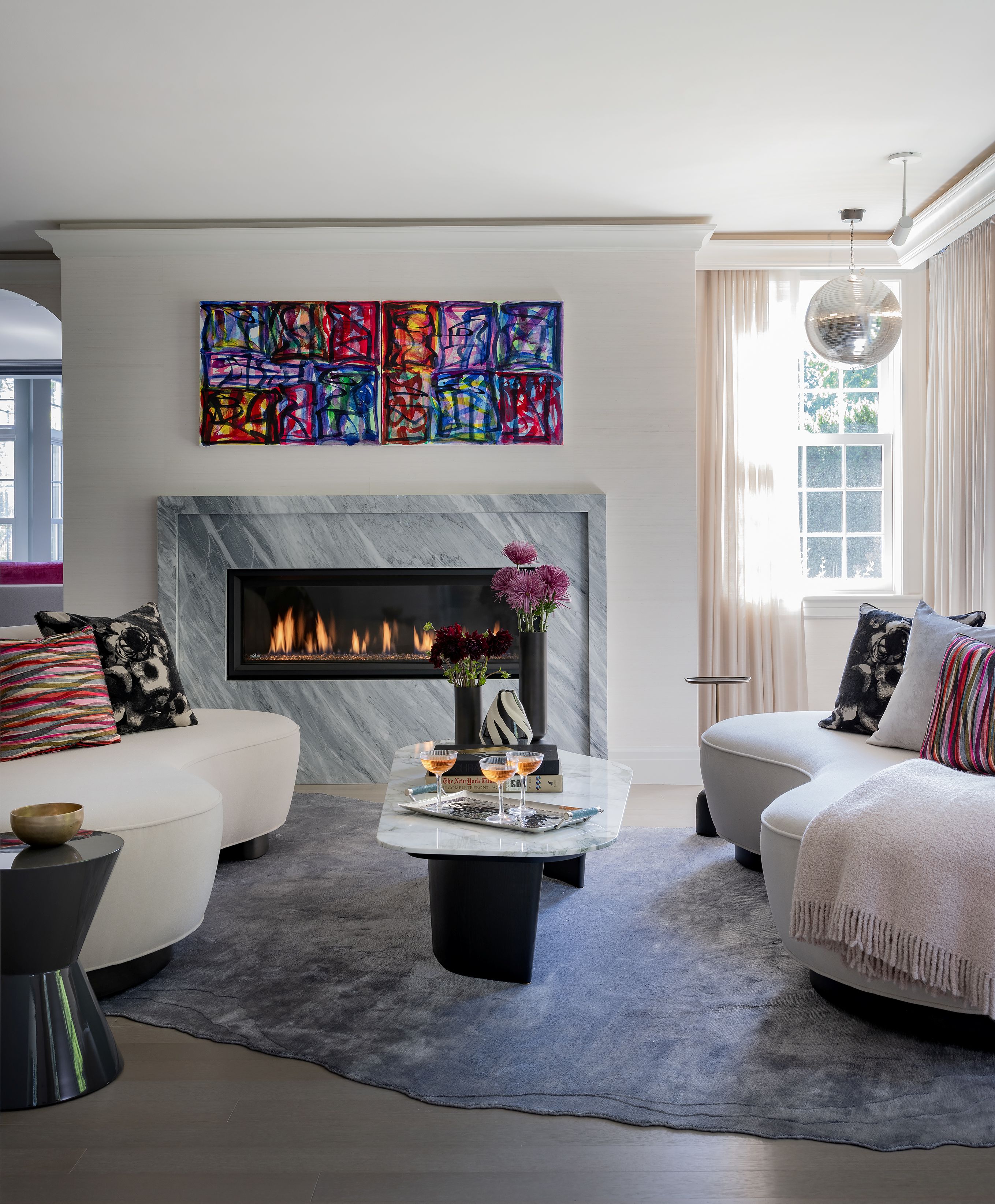 Built in 1933 in the Wellesley Farms neighborhood, this home has evolved with its owners, transitioning from a traditional family residence into a stylish space designed for entertaining and connection. The redesign marks a dramatic shift toward a contemporary aesthetic, defined by clean lines, a neutral palette, and art-forward moments throughout. In the lounge, a sleek white bar and playful disco ball set the tone for lively gatherings, while a Black Diamond stone fireplace and bold artwork provide striking focal points. To enhance light and openness, the conservatory was reimagined as the living room, where uncovered windows now flood the space with natural light and charcoal walls add contrast. The kitchen was simplified with a monochromatic palette and streamlined trim to emphasize height and openness, while bedrooms were refreshed with tailored upholstery and statement lighting. The result is a lighter, brighter home that balances modern style with warmth, inviting celebration and the creation of new memories.