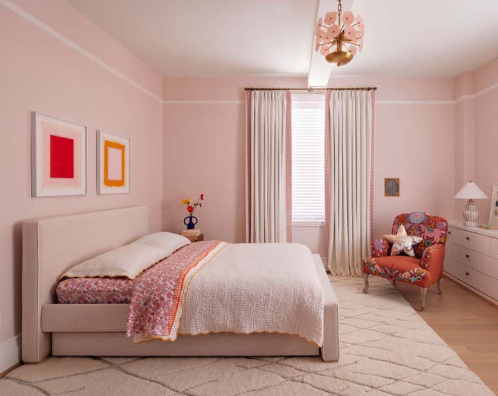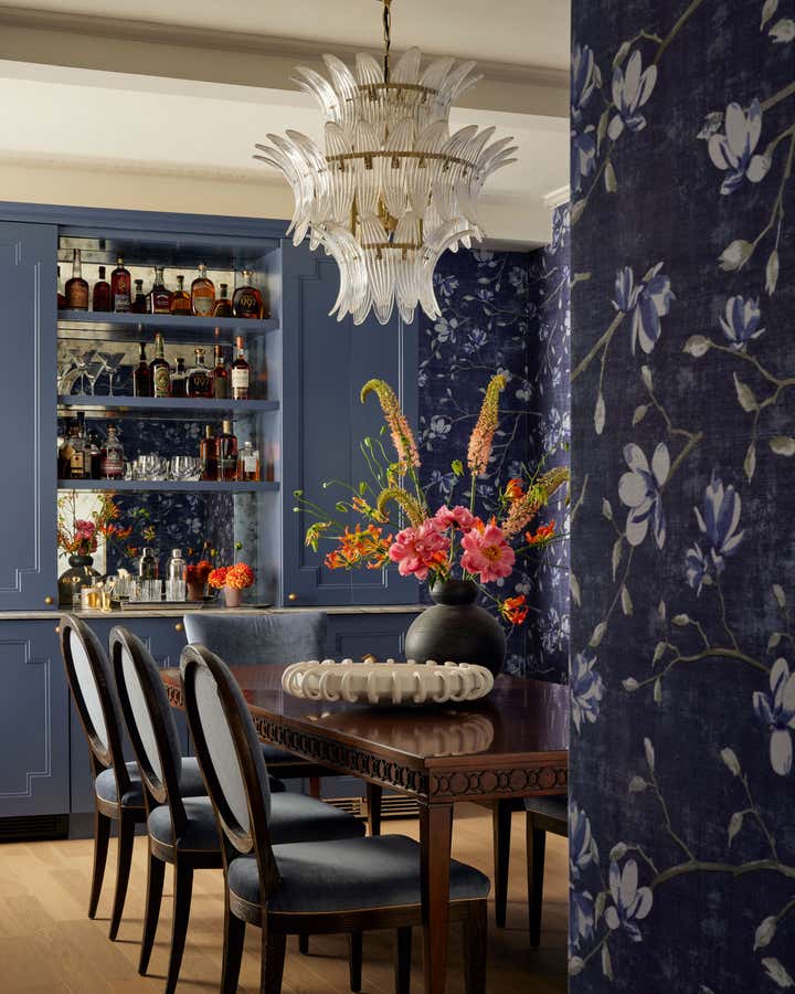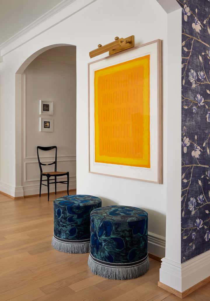 Our client’s desire to create a multi-functional home that would seamlessly accommodate a busy family life, as well as, year-round entertaining, was no small challenge. We outfitted the pre-war apartment with new floors, doors, moldings, lighting and modern bathrooms. Then came the color, and lots of it! The dining room features a bold blue floral wallpaper that carries into the rest of the home, paired with pops of yellow and pink.