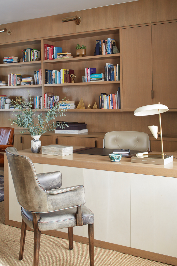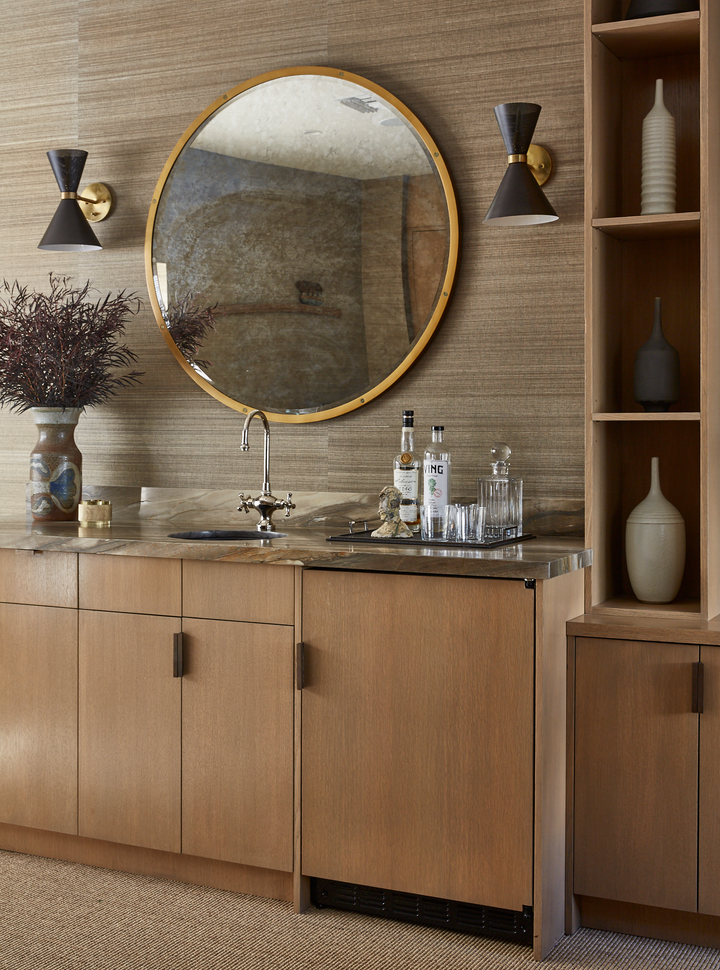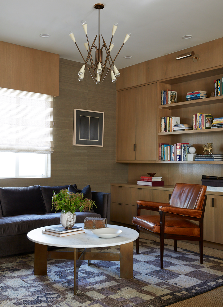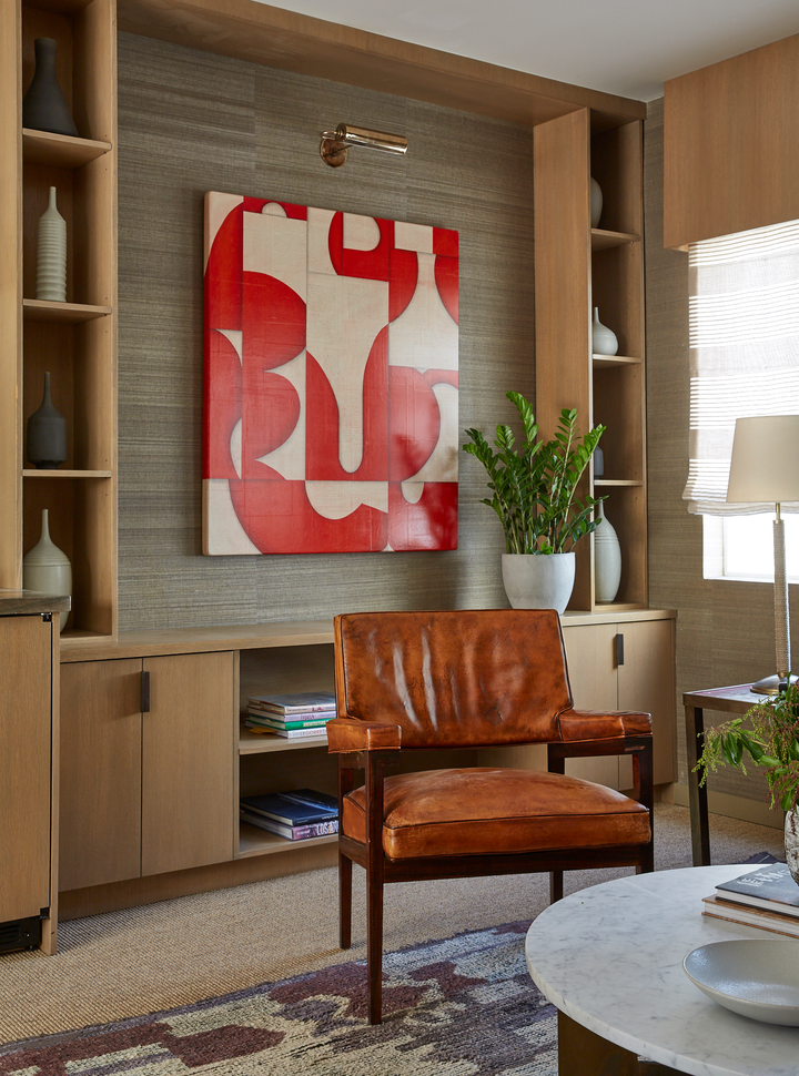 This office initially was a white box with a concrete floor, which was transformed with custom millwork, grasscloth on the walls and seagrass on the floor. We layered a Moroccan rug on top to create a seating area and added a vintage Italian fixture to further define the area. The wet bar was added along with ample cabinetry for book and file storage.