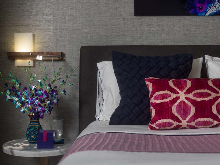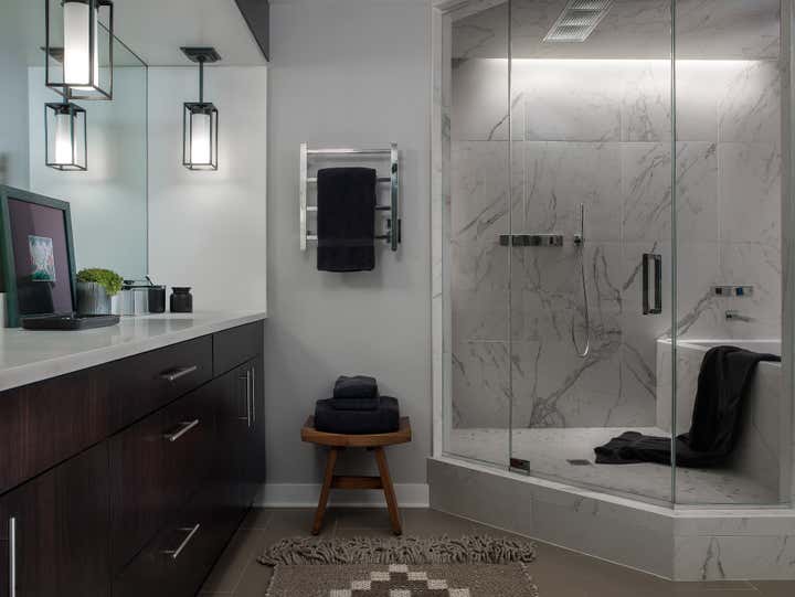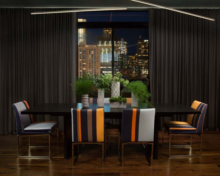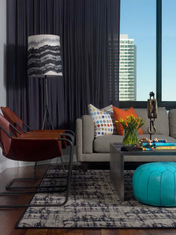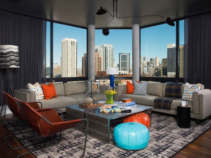 Steve + Filip were brought in to help newlywed couple reinvent a 3 bedroom 2 bath new construction condo with unbelievable views of downtown Chicago. The floorplan, flow and finishes were in need of a reboot, but S+F we happy to conjure a plan that would make the most of the space, views and light… while offering luxuries like a custom built walk-in closet, a fabulous master bedroom with attached library and spa bath. The outdoor spaces were conceptualized by S+F for use as dining and lounge areas with colorful furnishings that take inspiration from the palette created by neighboring buildings and sky. Designers deconstructed areas to expose concrete and metal elements, and added similar textures with custom millwork, metal work and fabrics. Unexpected colors and textures add warmth and interest to the otherwise minimalist undertone that is applied to the wall and flooring, cabinet and larger upholstery pieces.