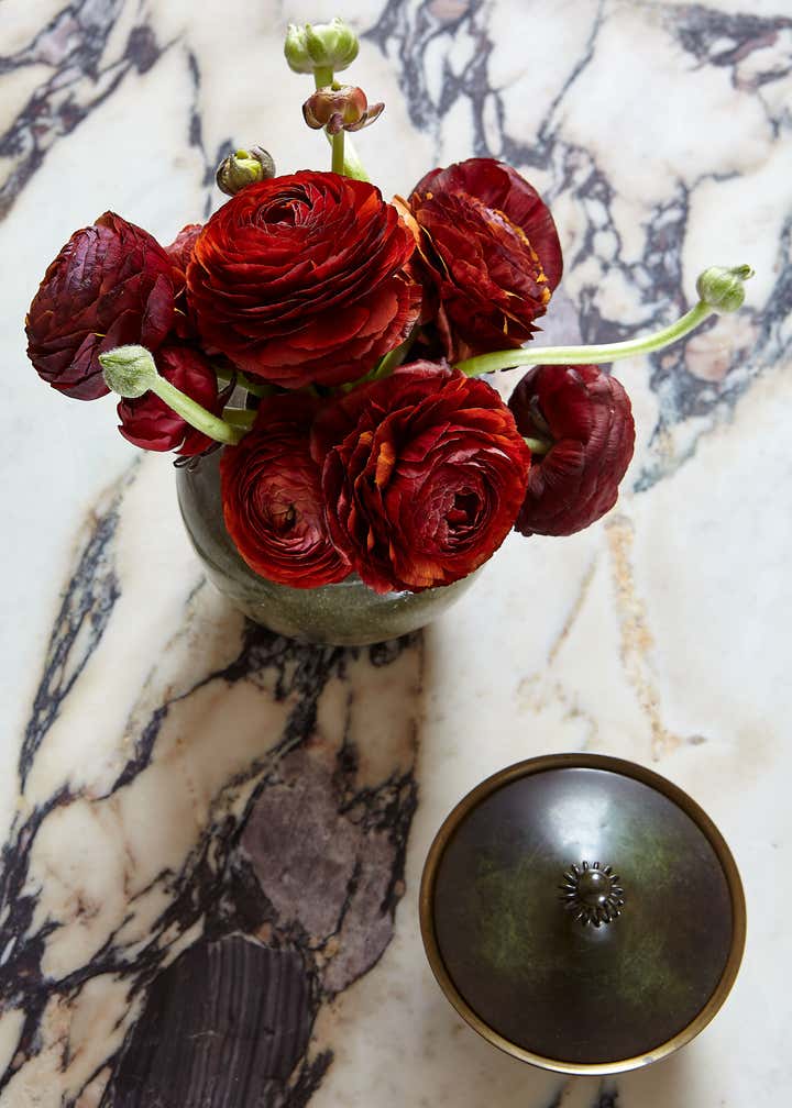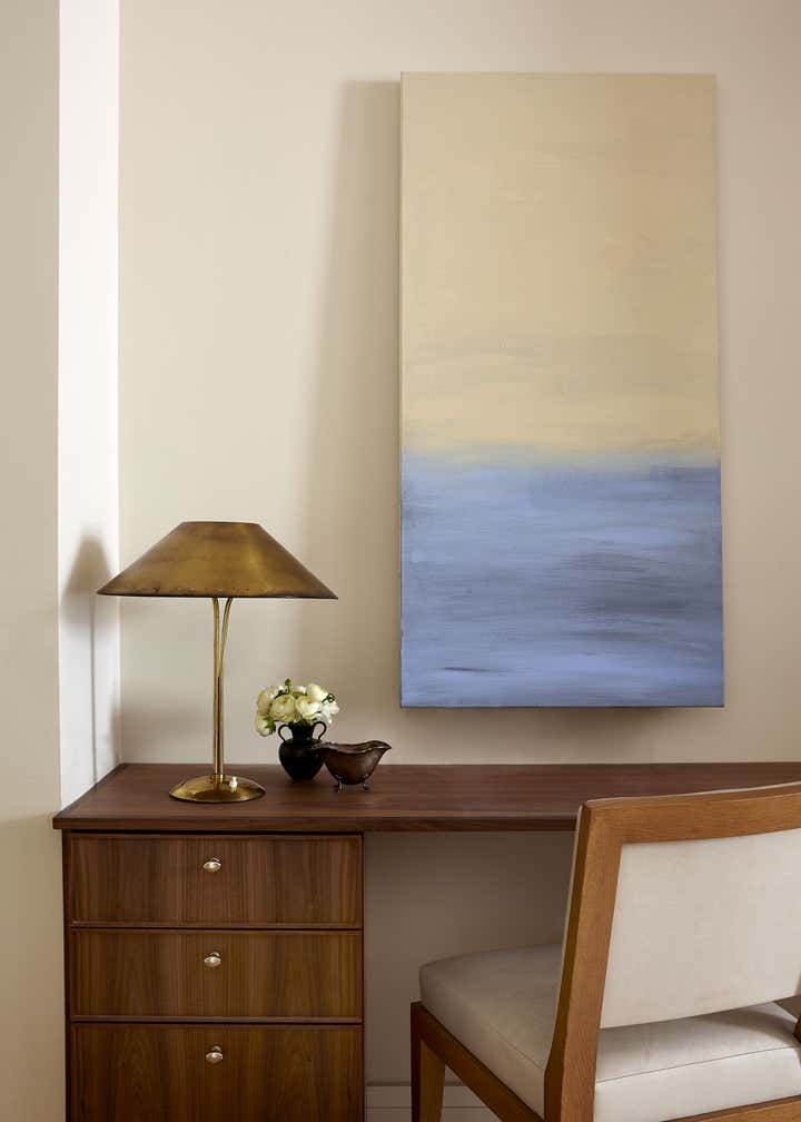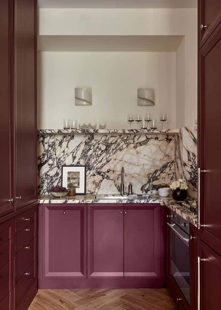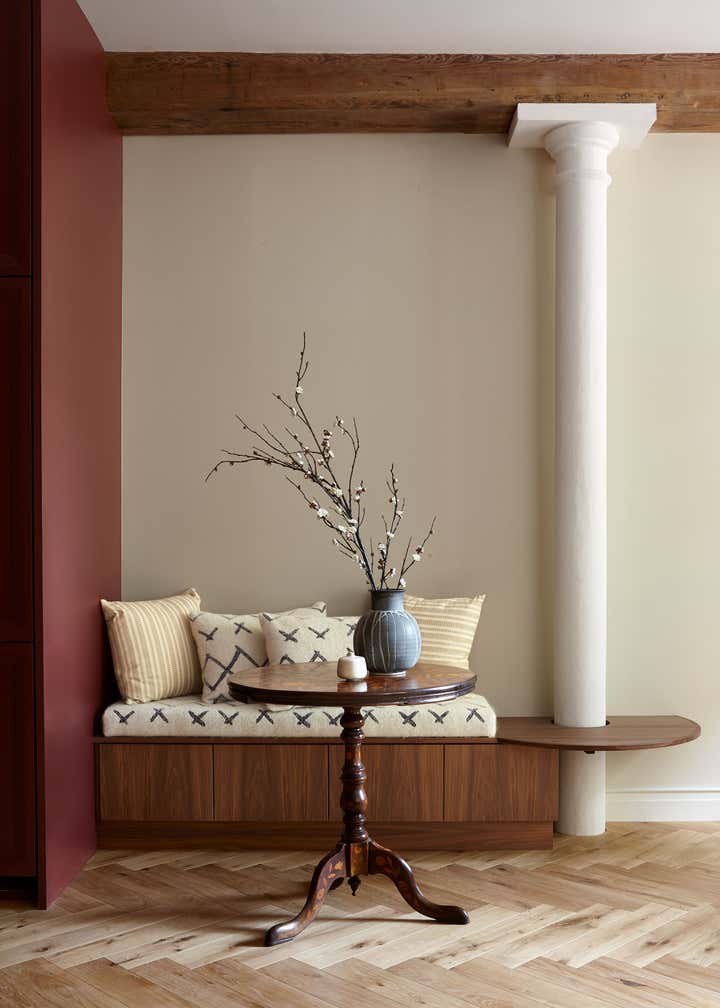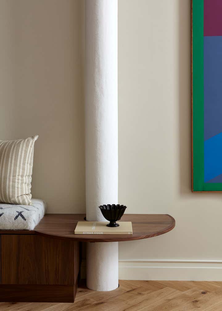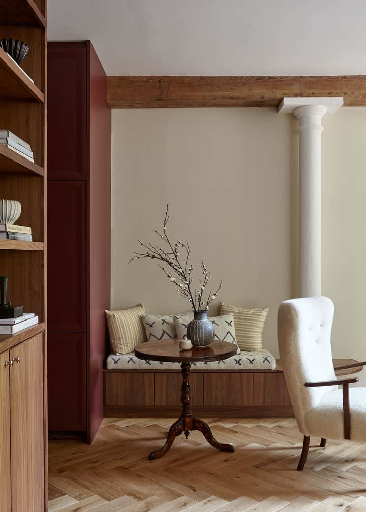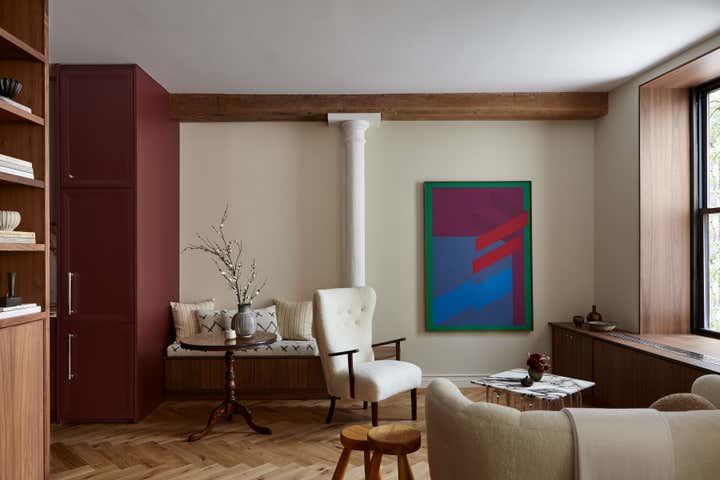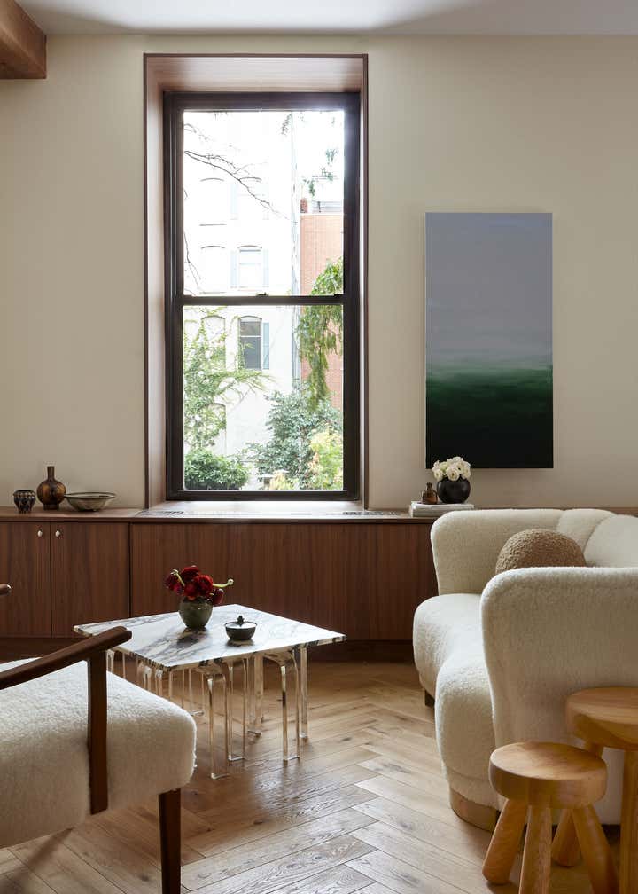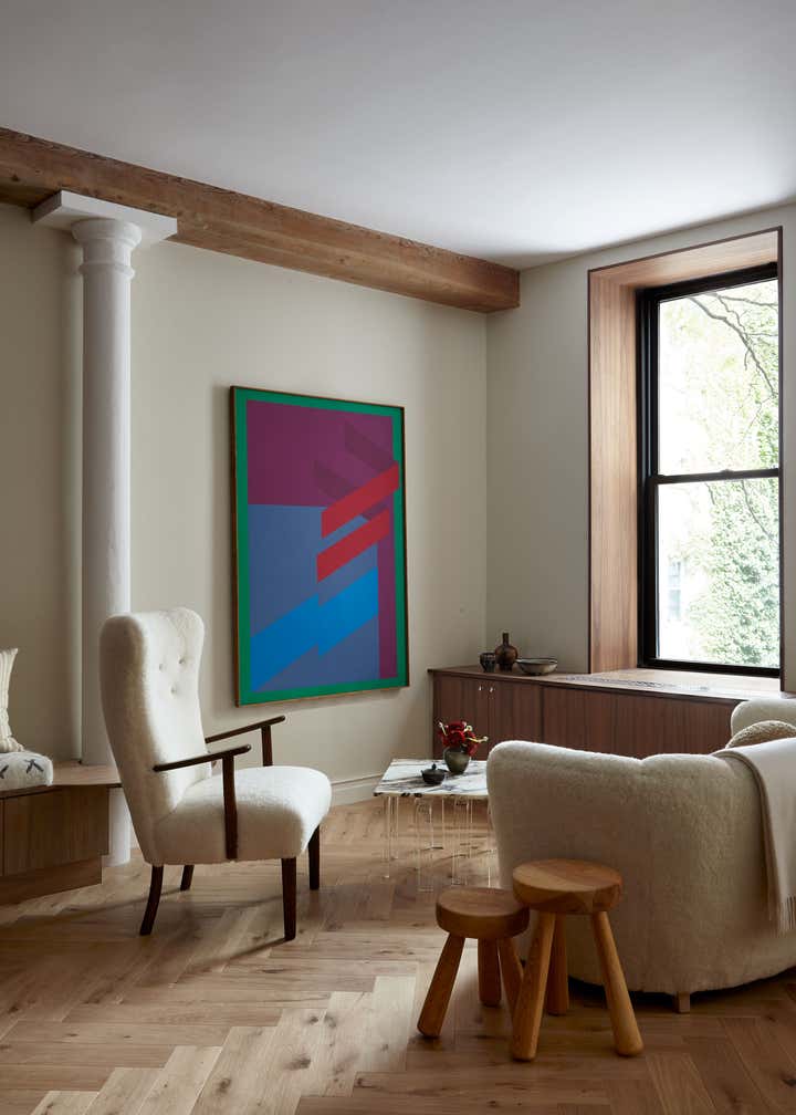 In this West Village residence renovation, Cochineal began by enhancing original features--high ceilings, large windows, a wood ceiling beam and an iron column, all circa 1930. In honor of the era, new design elements are Art Deco-inspired. Herringbone floors, mixed metal hardware, statement marble and rich tones exude modern, vintage allure. These bold style choices are balanced with soft, cream-colored furnishings and custom, minimalist millwork. The result is an engaging, cohesive space that is also functional.
