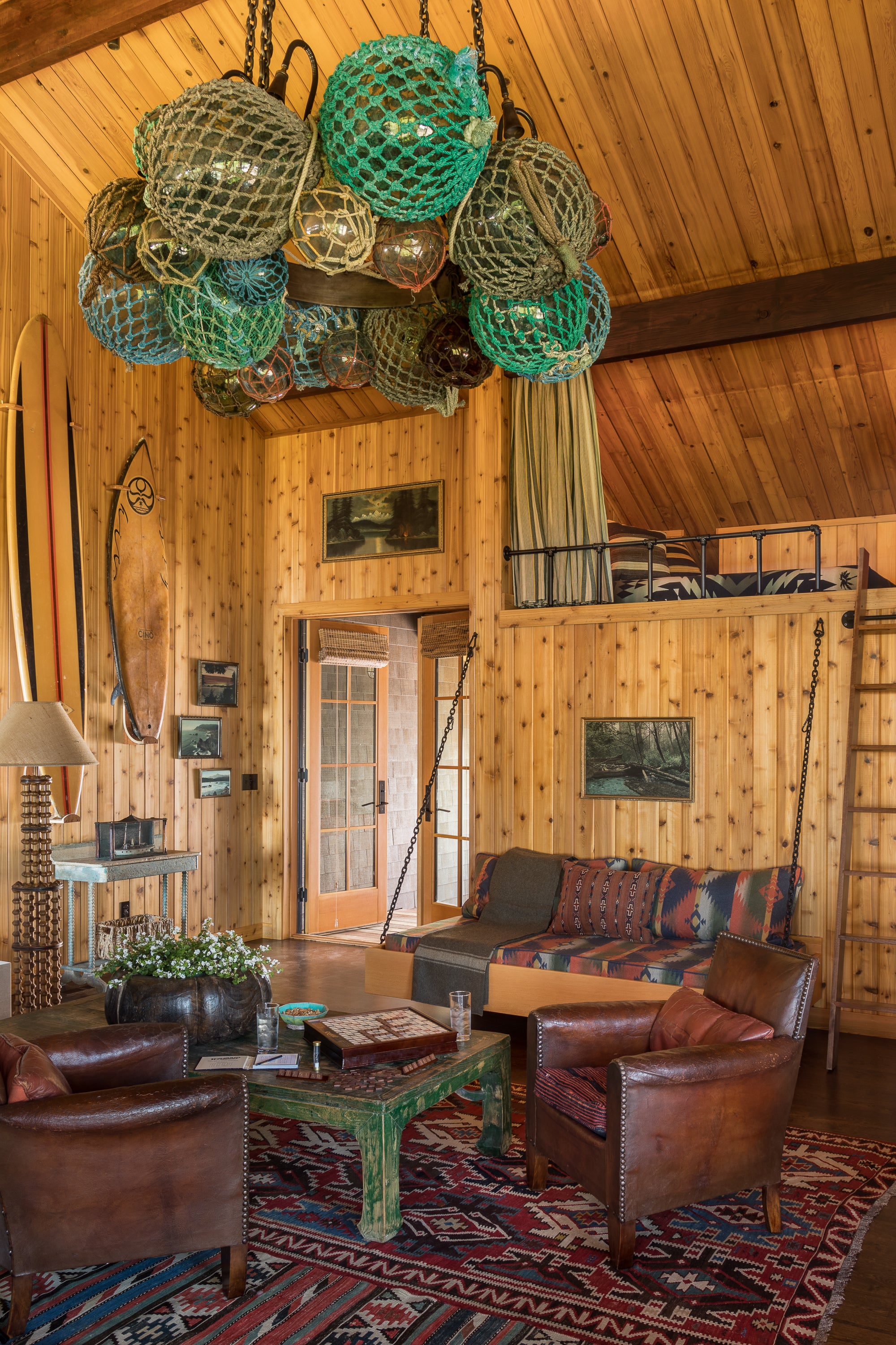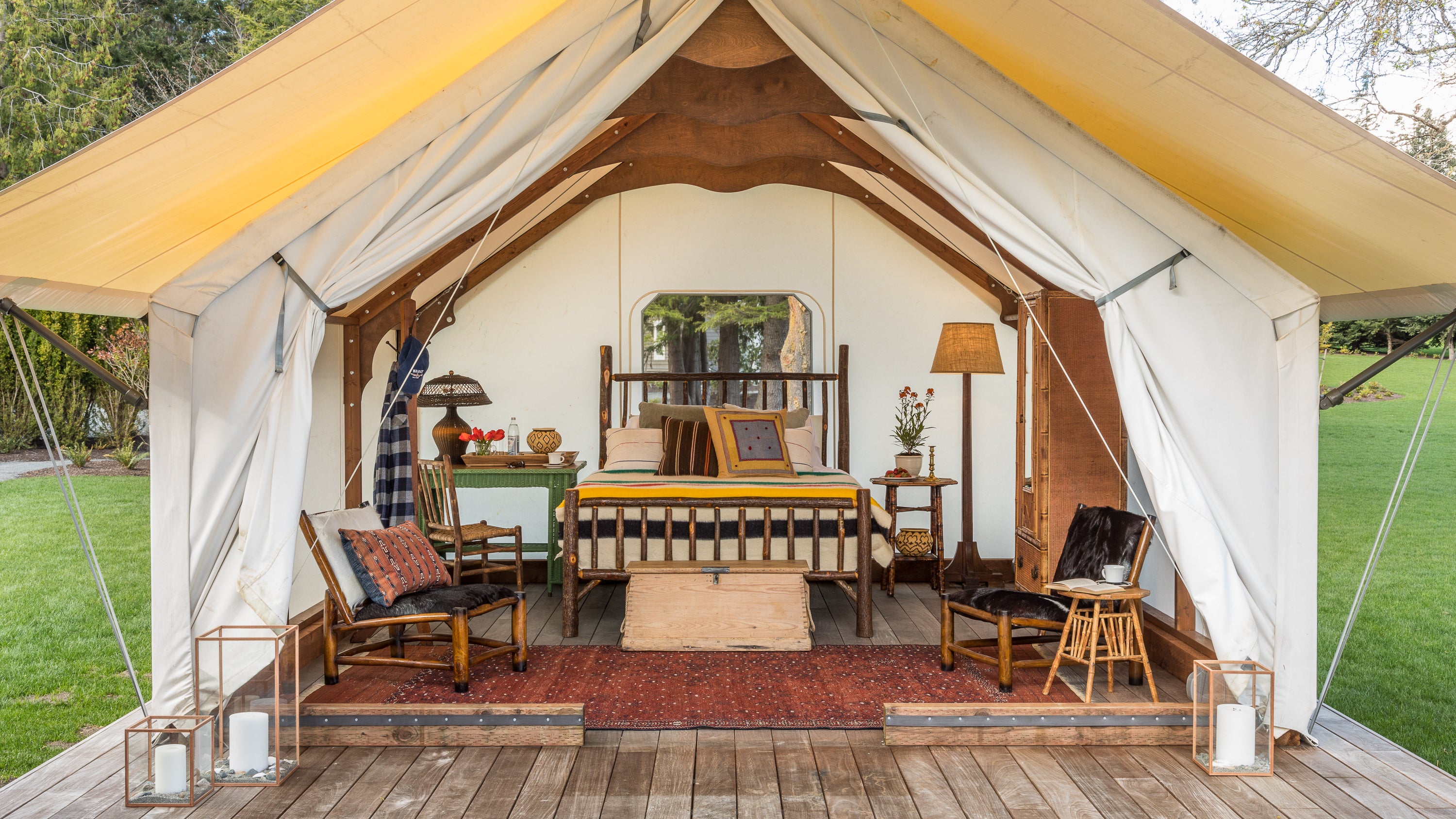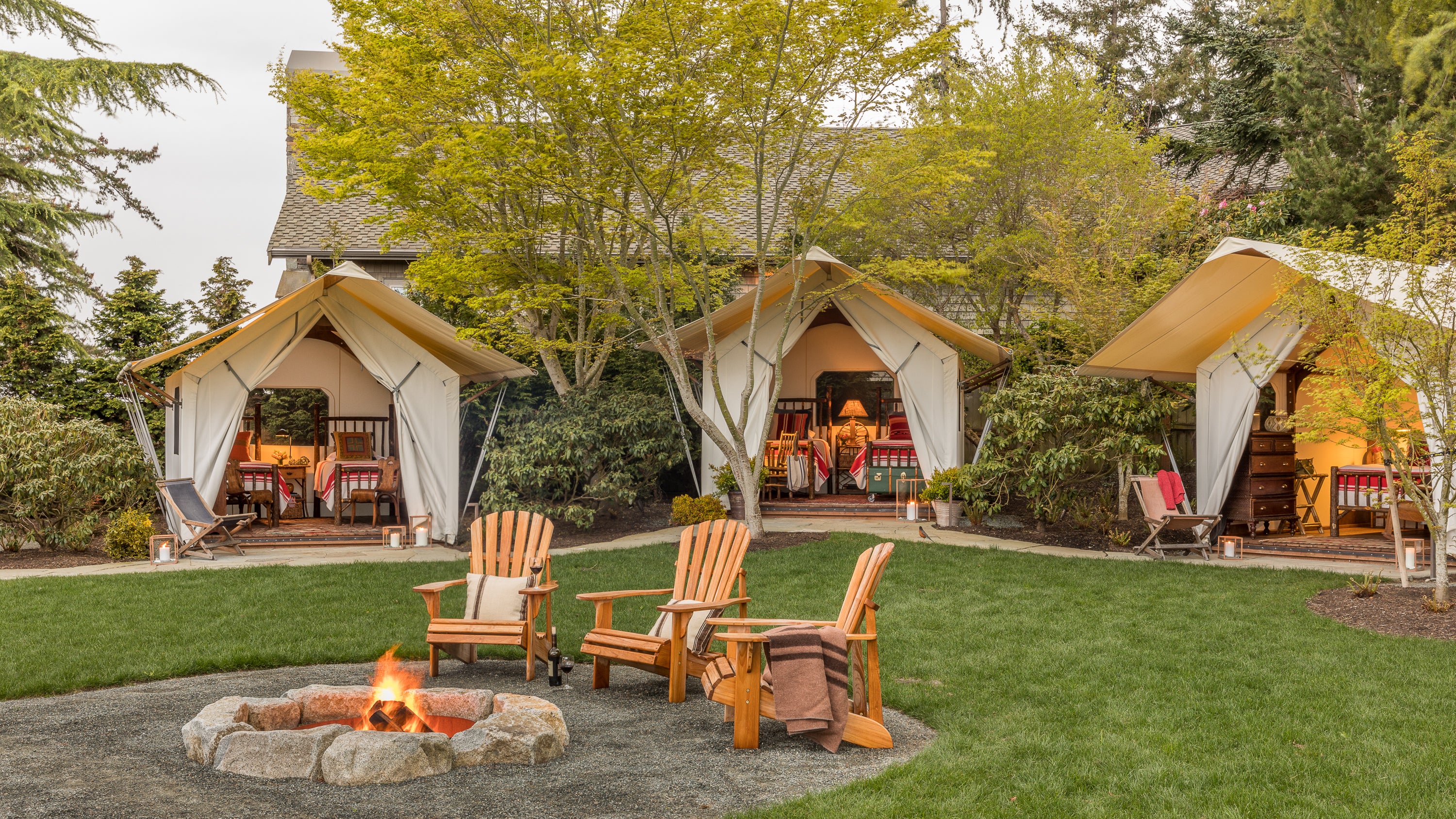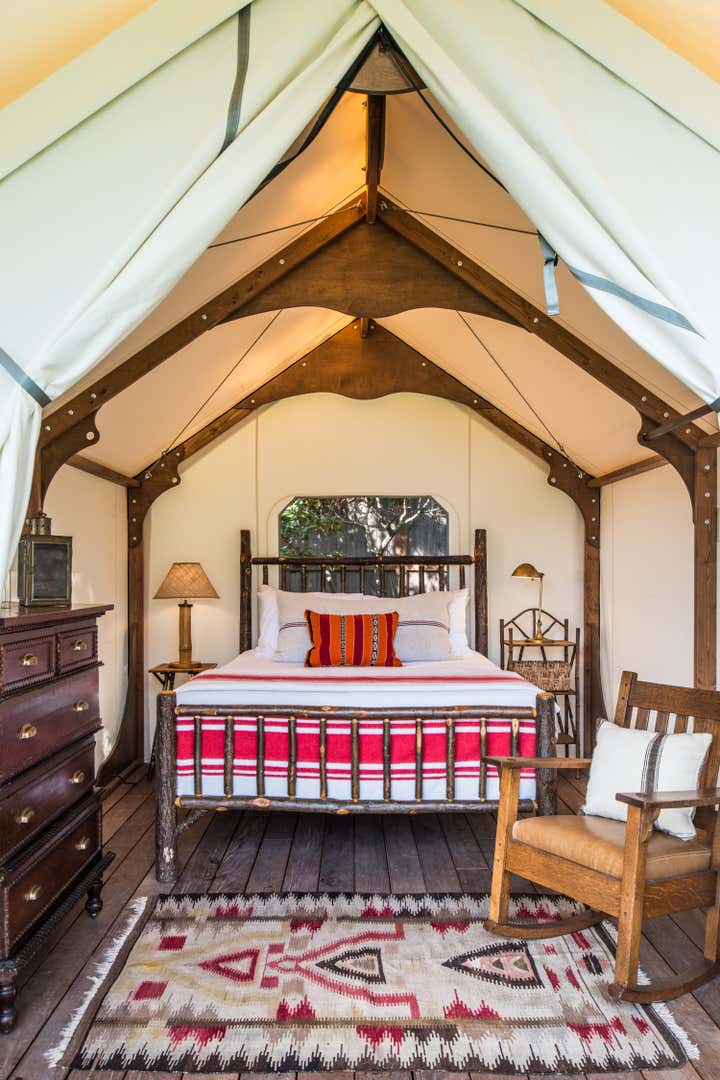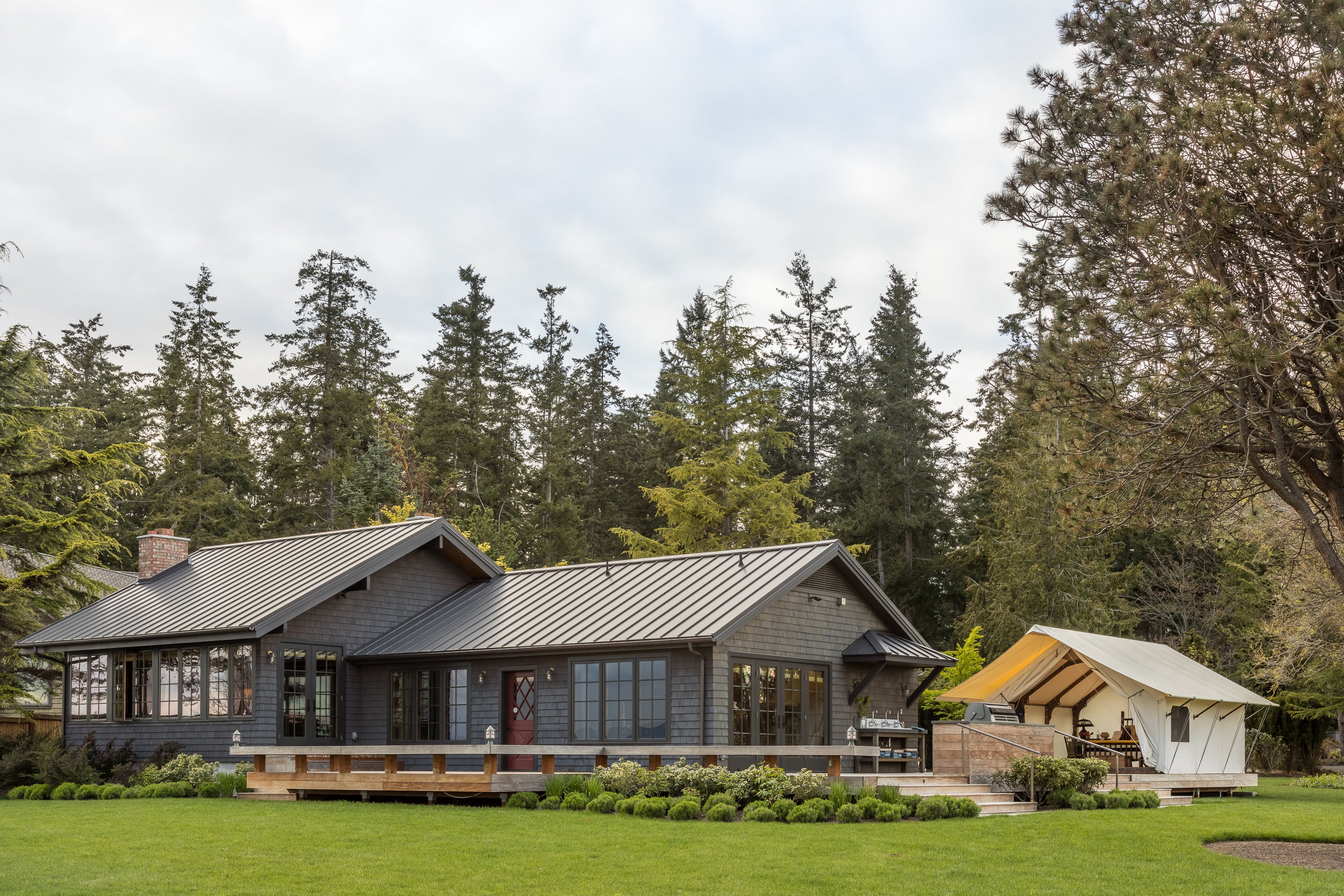 This project shows what happens when you focus on your strengths, defy convention, and take a few risks. The demolition of half the house made room for a camp-like setting of grand indoor spaces for gathering with great outdoor spaces for taking the sun and views, or gathering around the fire. Bedrooms were replaced by a collection of wall tents that lose nothing in luxury and gain everything in the connection to the great outdoors.