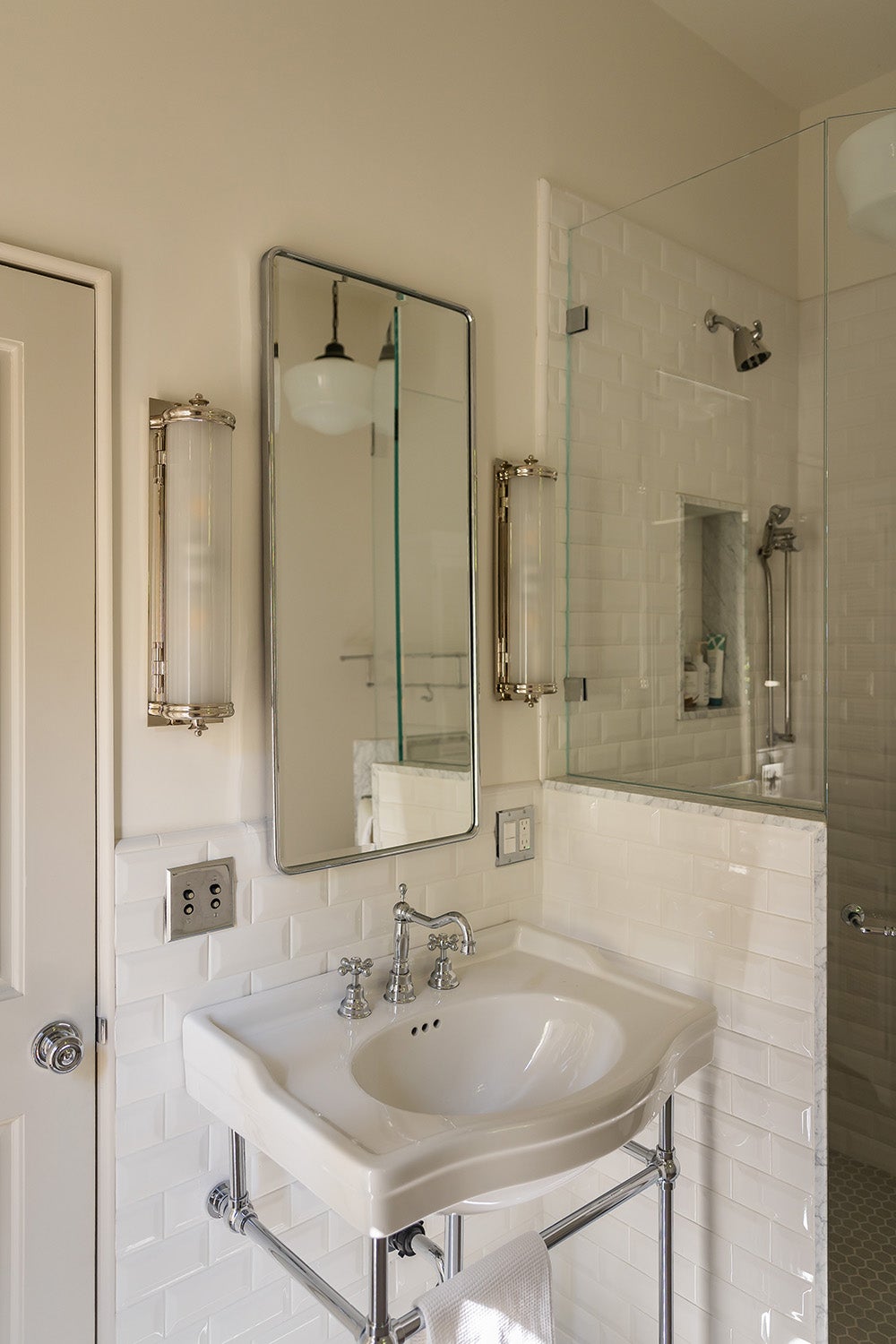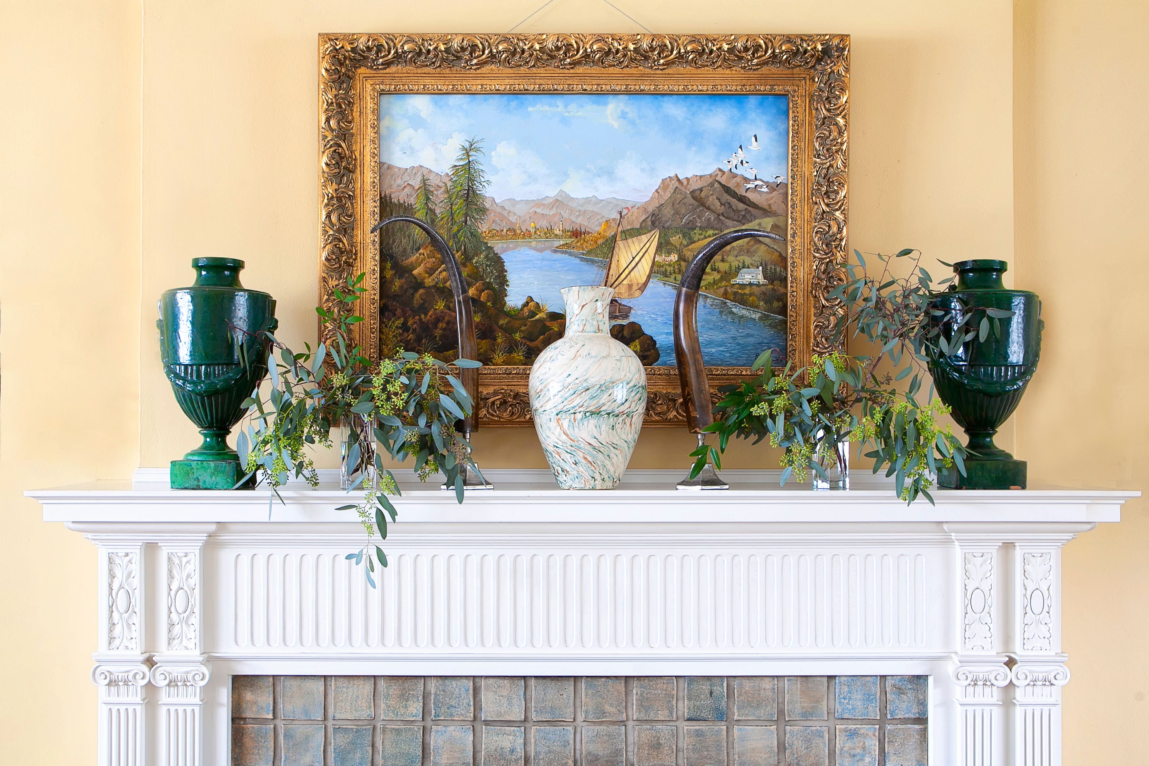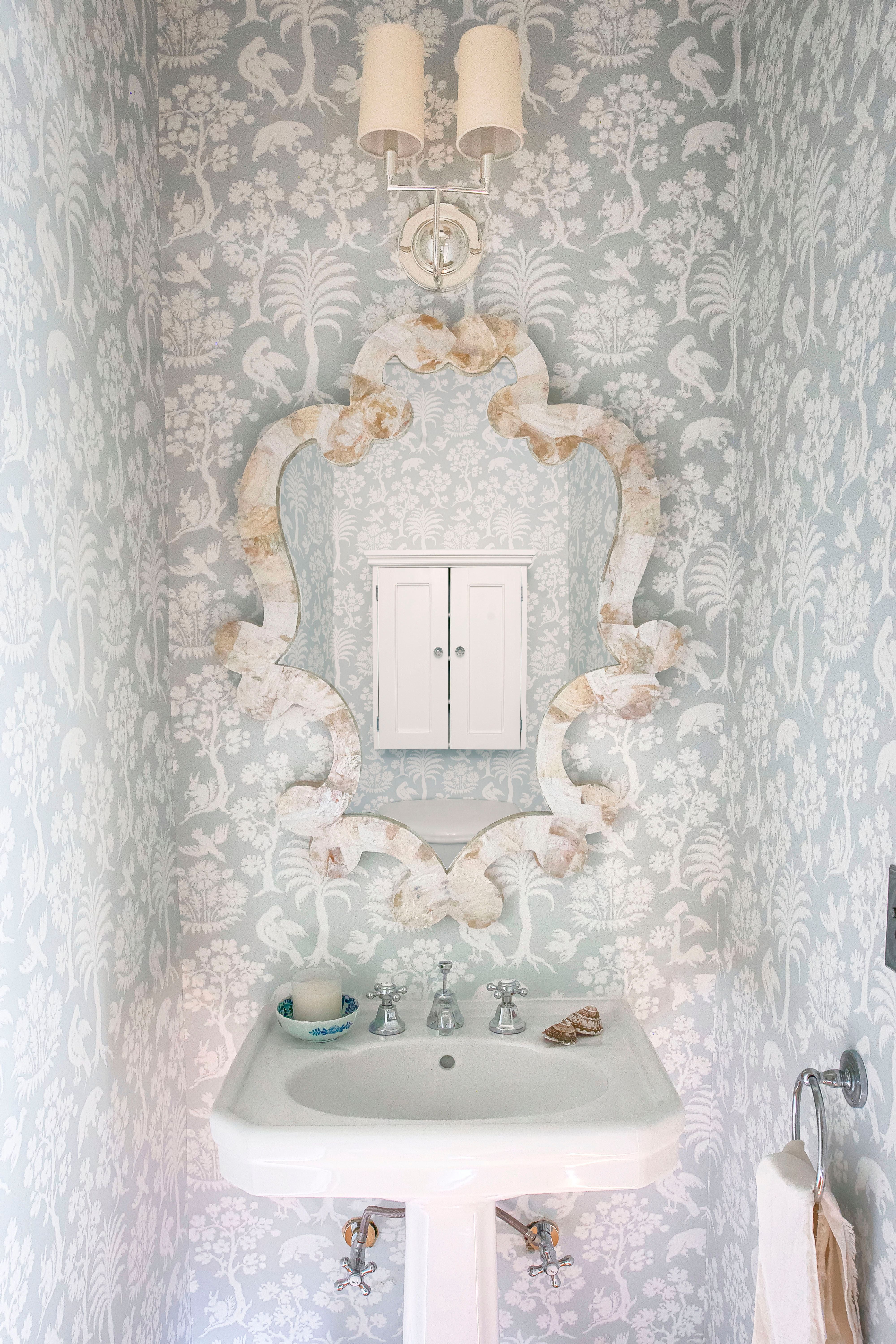 Interior moments within the garden wing reinforce the home’s heritage. A charming bath features hand-printed botanical wallpaper, soft green beadboard, and a restored clawfoot tub, creating a romantic early-20th-century vignette. A nearby powder room pairs a sculptural Venetian-style mirror with pale patterned walls, offering a crisp, whimsical counterpoint to the garden’s softness.