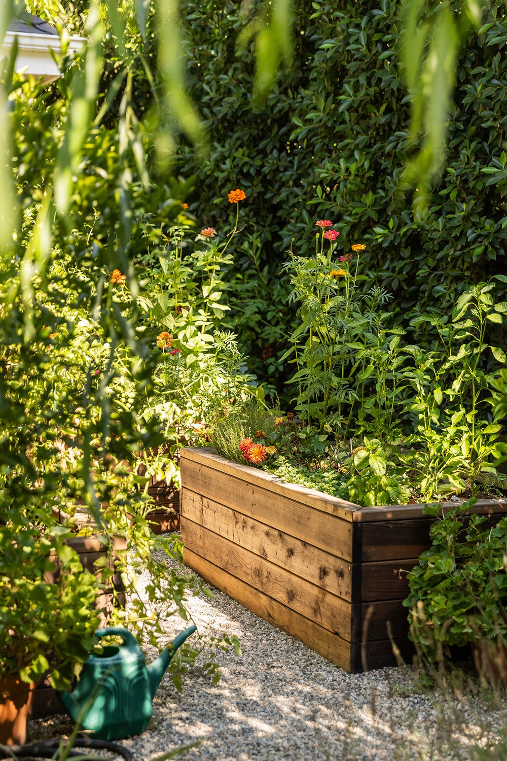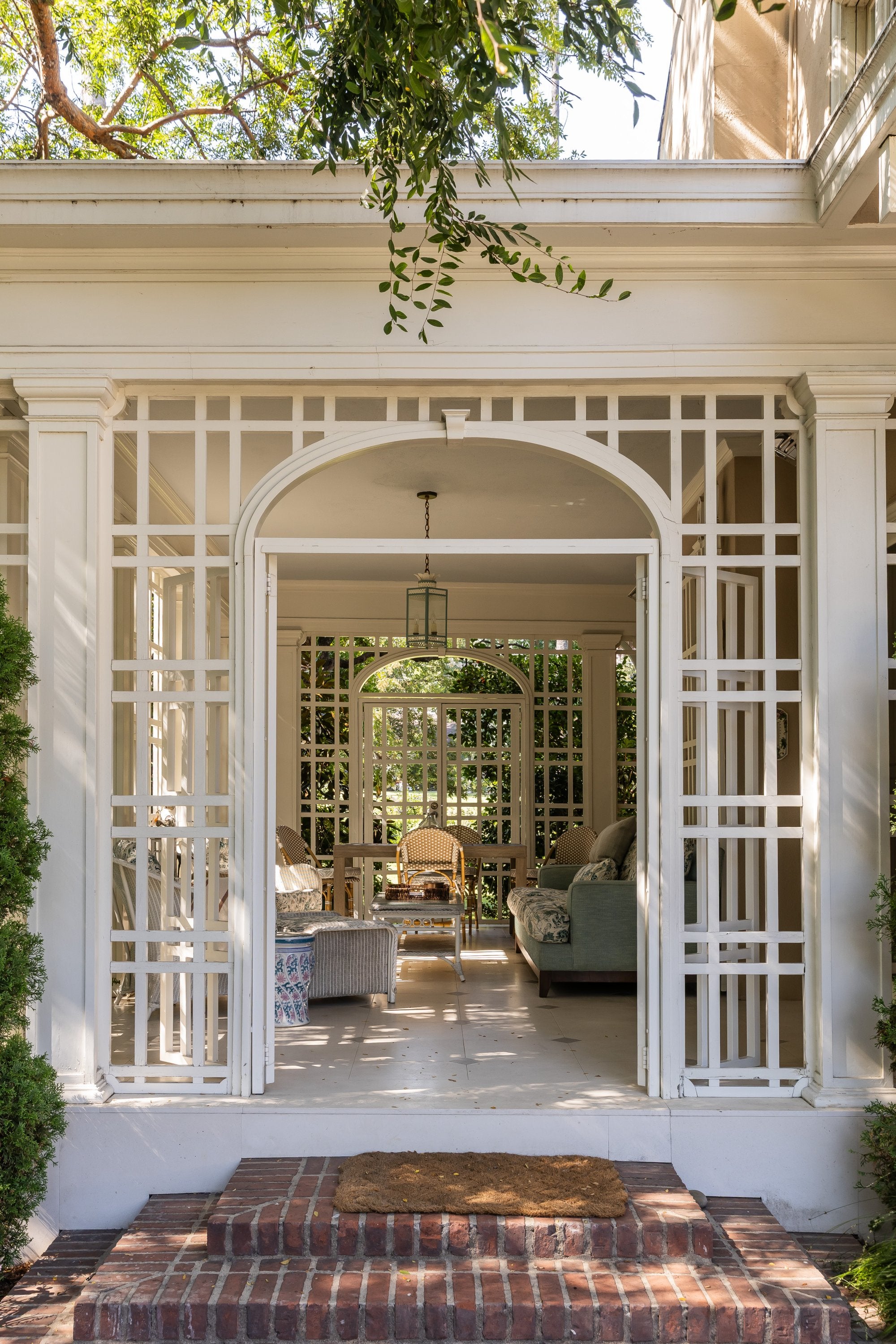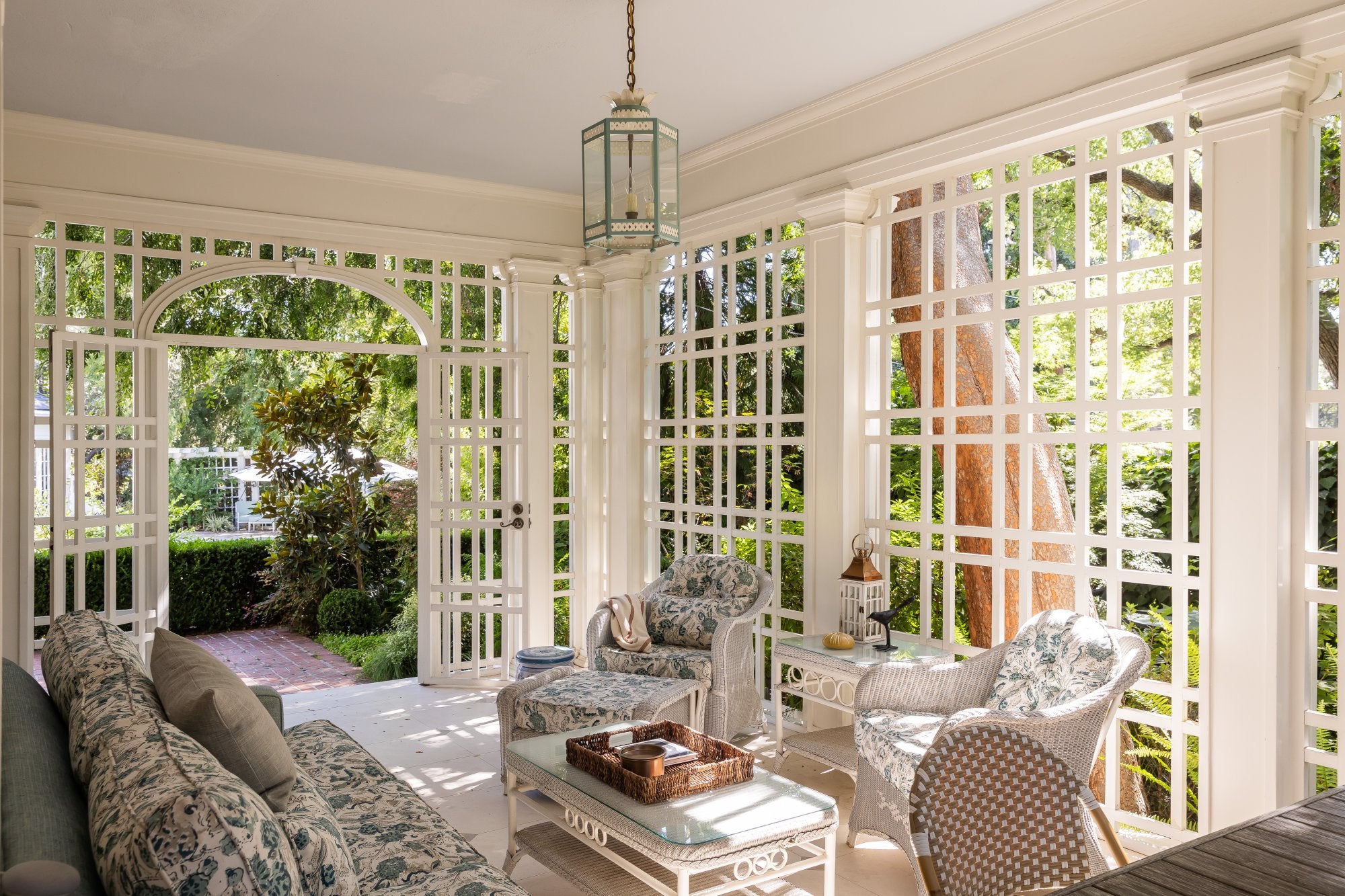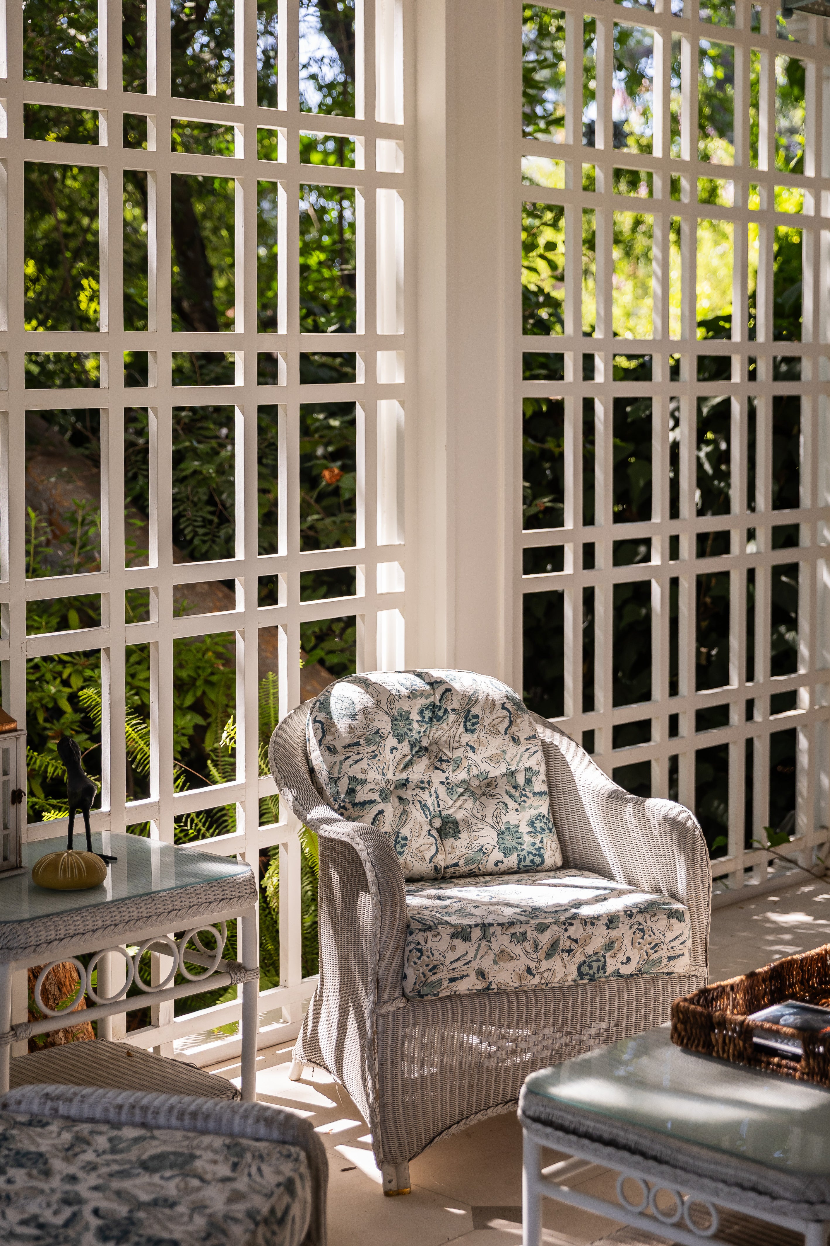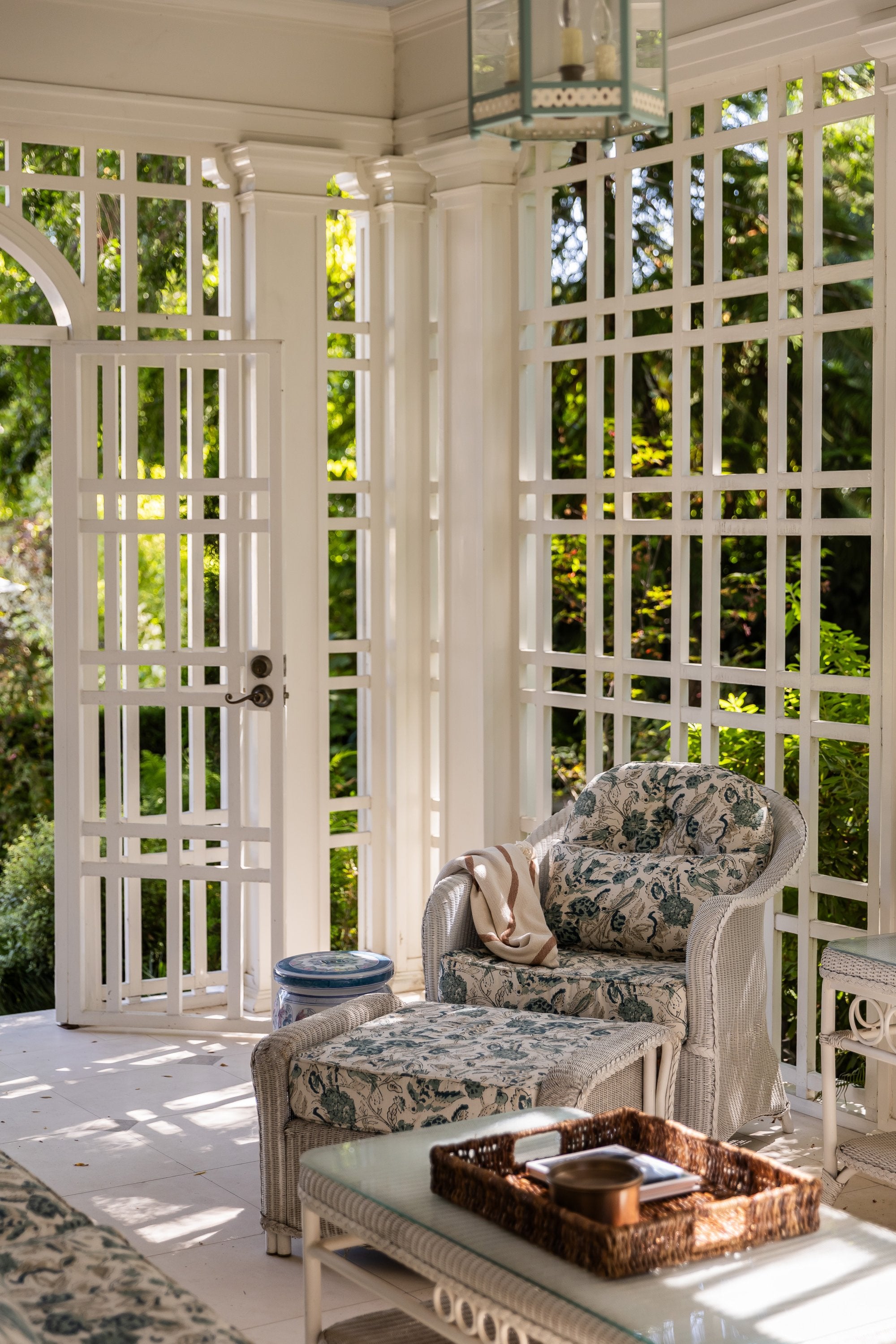 Vintage wicker seating was restored and reupholstered in classic garden prints that echo the filtered greenery just beyond the screens. Lantern lighting, woven trays, ceramic stools, and quietly patinated accessories add warmth without disturbing the airiness of the space.