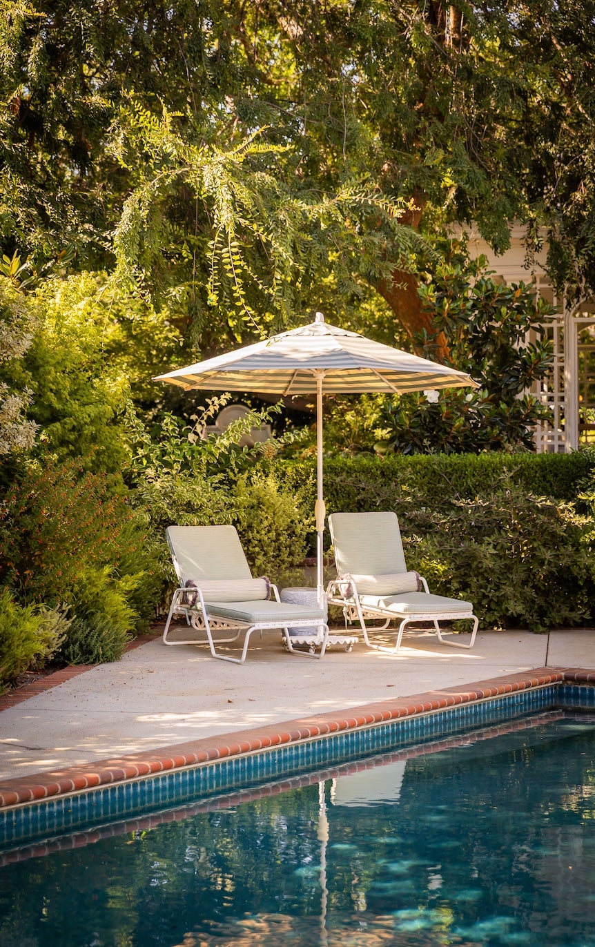 The pool terrace continues the story with scalloped loungers, striped shade, and lush plantings—a sun-washed moment that feels both nostalgic and distinctly Californian.