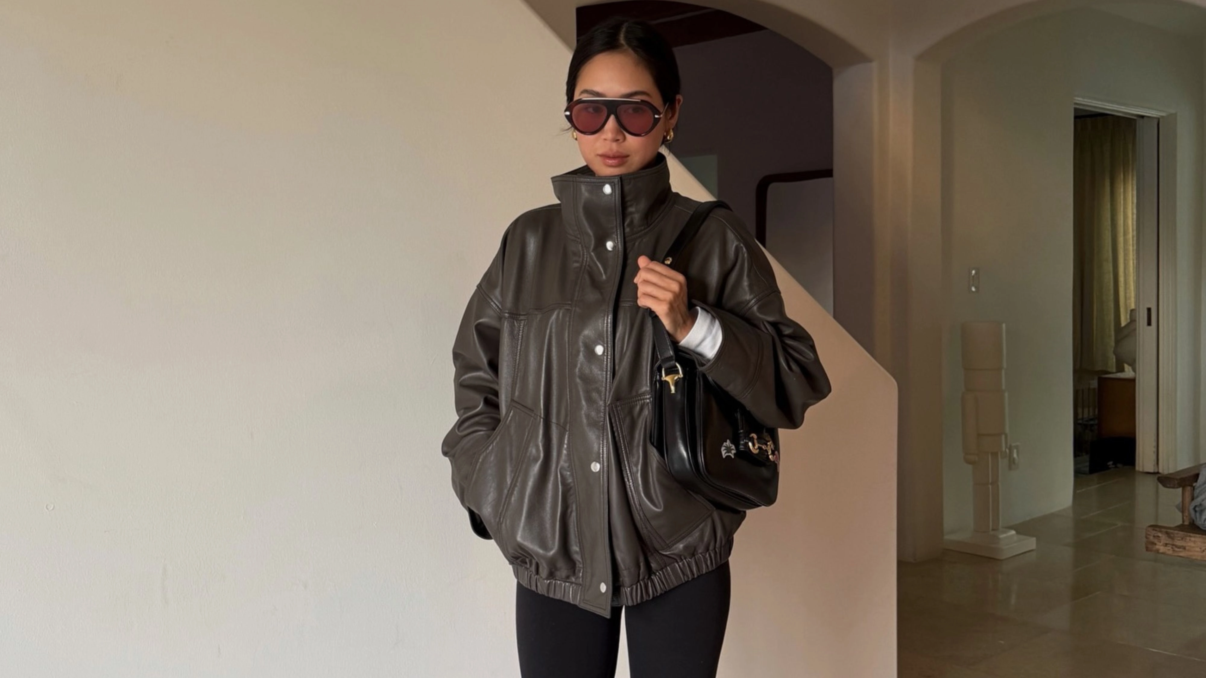 Accessories take this cinched-waist leather jacket ensemble to the next level, leaning into cherry red tube socks, a Gucci shoulder bag, and statement sunglasses. It’s the epitome of casual-cool.