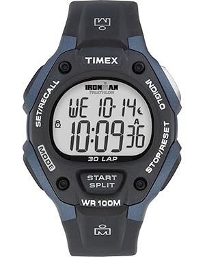 The Timex Ironman Classic 100 features a large display and fast 5-button access to 100-lap stopwatch memory, customizable alarm and interval/countdown timers. Water-resistant to 100 meters with Timex Indiglo backlight.